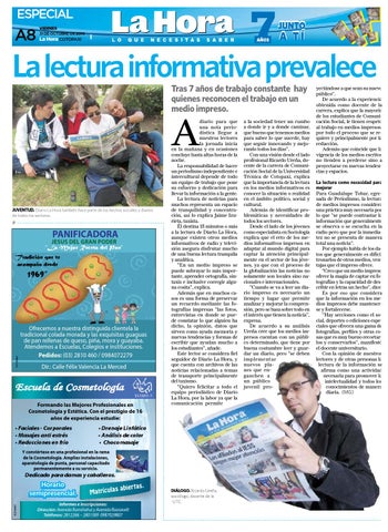 diario para que una nota periodística llegue a nuestros lectores la jornada inicia en la mañana y en ocasiones concluye hasta altas horas de la noche. La responsabilidad de hacer un periodismo independiente e intercultural depende de todo un equipo de trabajo que pone su esfuerzo y dedicación para llevar la información a la gente. La lectura de noticias para muchos representa un espacio de tranquilidad y concentración, así lo explica Jaime Izurieta, taxista. Él destina 15 minutos o más a la lectura de Diario La Hora, aunque existen otros medios informativos de radio y televisión asegura disfrutar mucho de una buena lectura tranquila y analítica. “En un medio impreso se puede subrayar lo más importante, aprender ortografía, sintaxis e inclusive corregir alguna cosita”, explica. Además que en muchos casos es una forma de preservar un recuerdo mediante las fotografías impresas “las fotos, entrevistas en donde se puede constatar lo que alguien ha dicho, la opinión, datos que sirven como ayuda memoria y nuevas tendencias y formas de escribir que ayudan mucho a los estudiantes”, añade. Este lector se considera fiel seguidor de Diario La Hora, y que cuenta con archivos de las noticias relacionadas a temas de transporte principalmente del taxismo. “Quiero felicitar a todo el equipo periodístico de Diario La Hora, por la labor ya que la comunicación permite