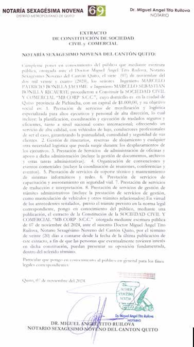 El señor Alex Vinicio Bustillos Vélez en calidad de GERENTE GENERAL de la COMPAÑIA DE TAXIS BUSTILLOSVELEZ ByV S.A. procede a convocar a una Junta Extraordinaria de socios el día: Jueves 21 de noviembre del 2024.