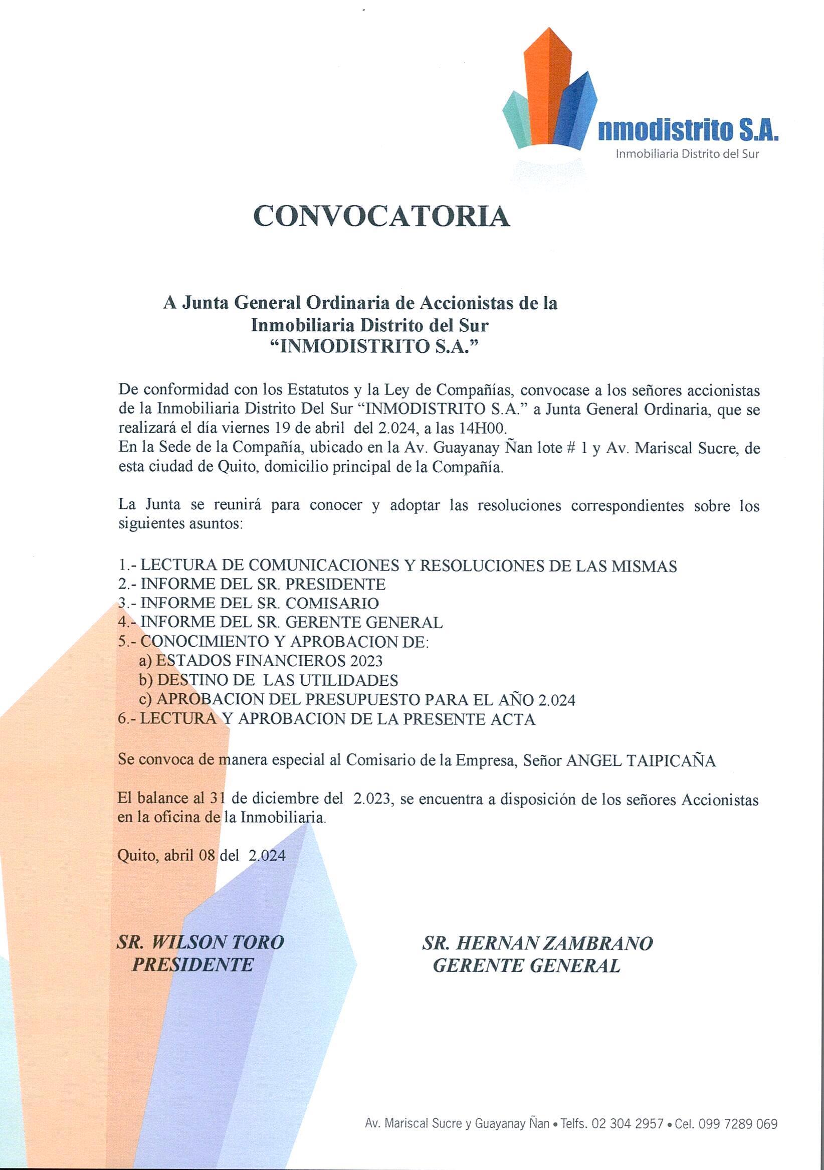 La Gerencia General de conformidad con lo estipulado en el Artículo N° 231 de la Ley de Compañías y el Artículo Octavo del Estatuto Social, convoca a los señores accionistas a la Junta General Ordinaria que se llevará a cabo el día miércoles 10 de abril de 2024 a las 17:00 en las oficinas de la empresa, situadas en las calles Av. Galo Plaza Lasso N55-52 y Pasaje Pedro Barrios para revisar, conocer, resolver y aprobar los puntos que se detallan a continuación.