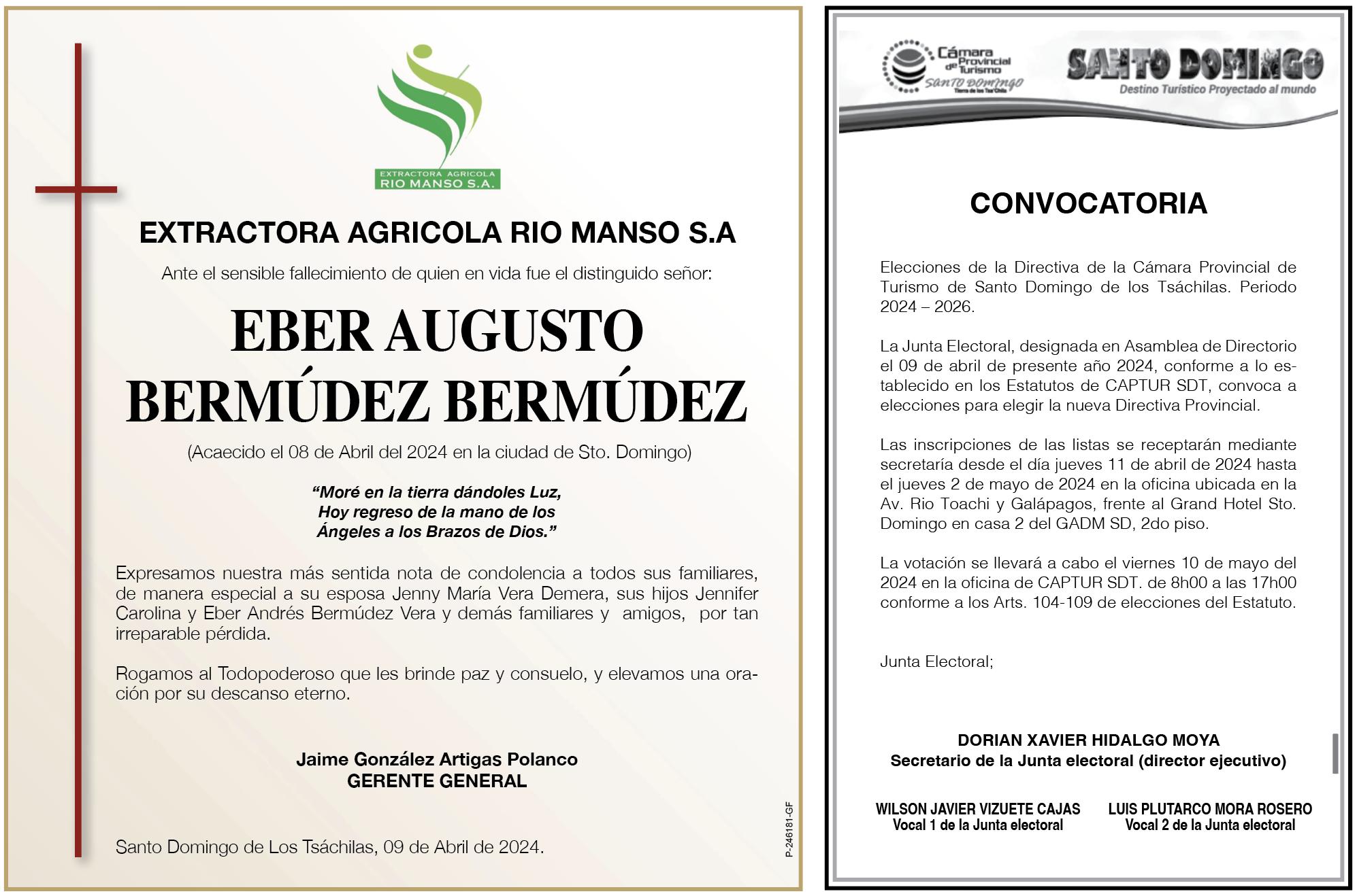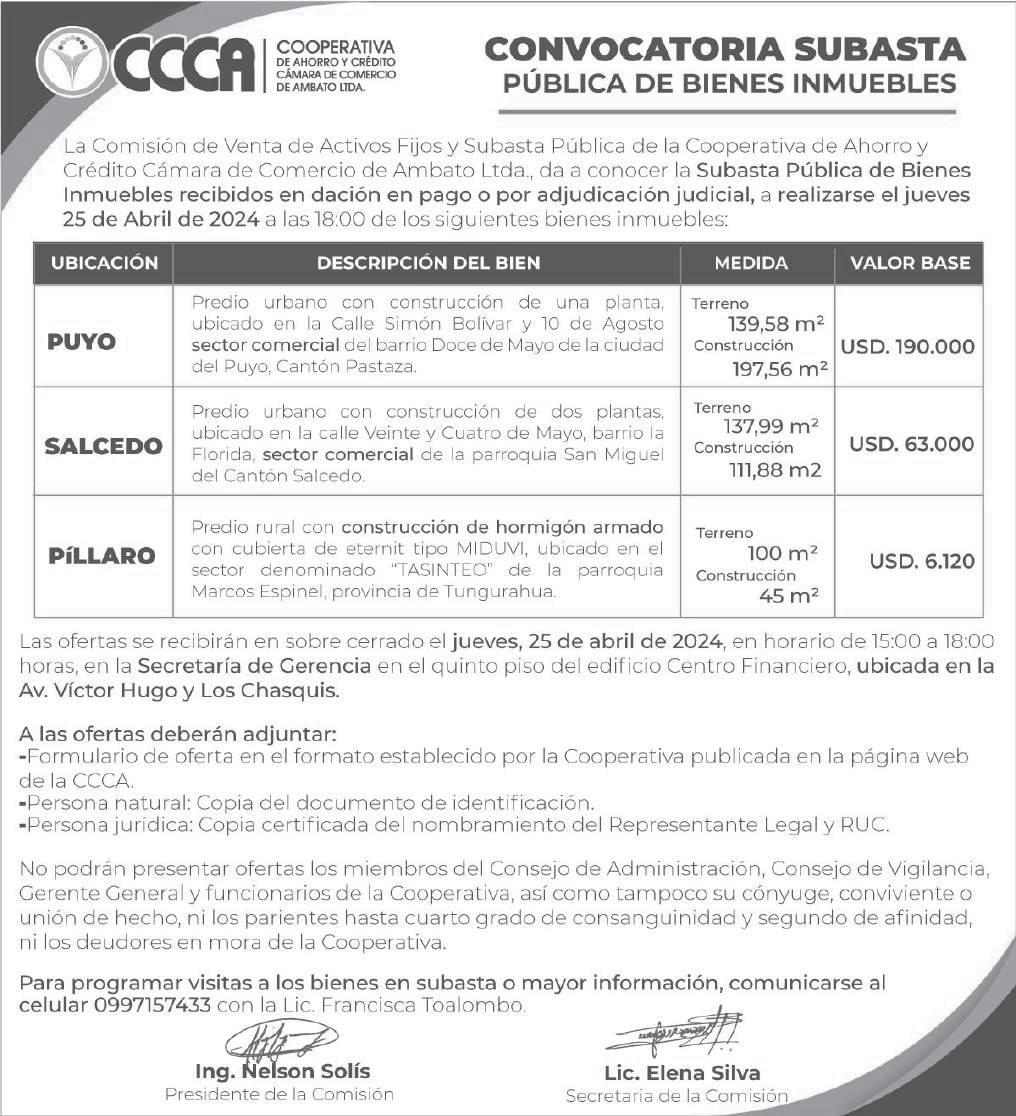 Se convoca a los señores accionistas de la compañía a la Junta General Ordinaria, el día viernes 12 de Abril del 2024, a las 17:00 horas, en primera convocatoria, en el domicilio social, calle S45B N° Oe3-28 y Quitumbe Ñan (Cdla del Ejercito), para tratar el siguiente: