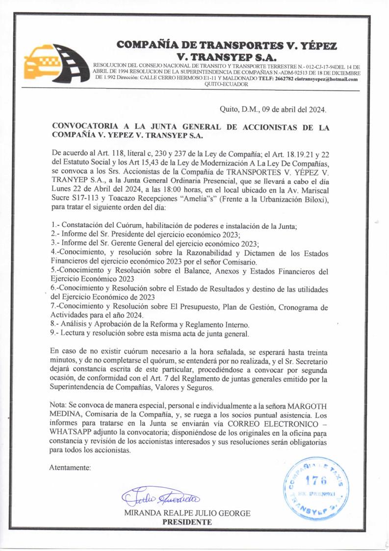 ANONIMA.; convoca con carácter de obligatorio a todos sus Accionistas; a la JUNTA GENERAL EXTRAORDINARIA DE ACCIONISTAS, la misma que se llevara a cabo el día martes 16 de abril del 2024 a las 14:00 pm, en nuestra oficina ubicada en la parroquia de Calderón sector Llano Grande Conjunto Santa Mónica local 09 calle 23 de abril N4-282; con la finalidad de tratar lo siguiente:
