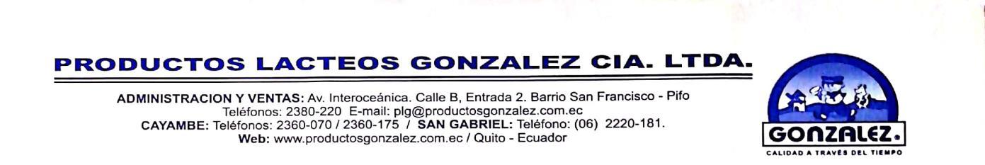 Atentamente, Juan Martin González Lalama GERENTE GENERAL Y REPRESENTANTE LEGAL PRODUCTOS LACTEOS GONZALEZ CIA