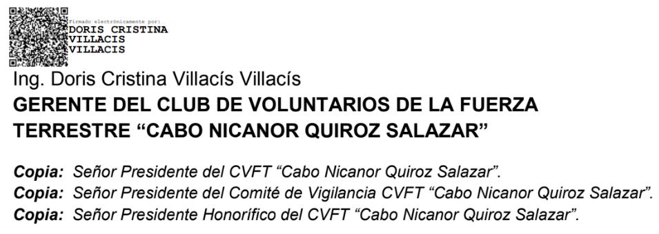 Ing. Doris Cristina Villacís Villacís, en mi calidad de Gerente y Representante Legal del Club de Voluntarios de la Fuerza Terrestre “Cabo Nicanor Quiroz Salazar”, me dirijo a ustedes respetuosamente y manifiesto:
