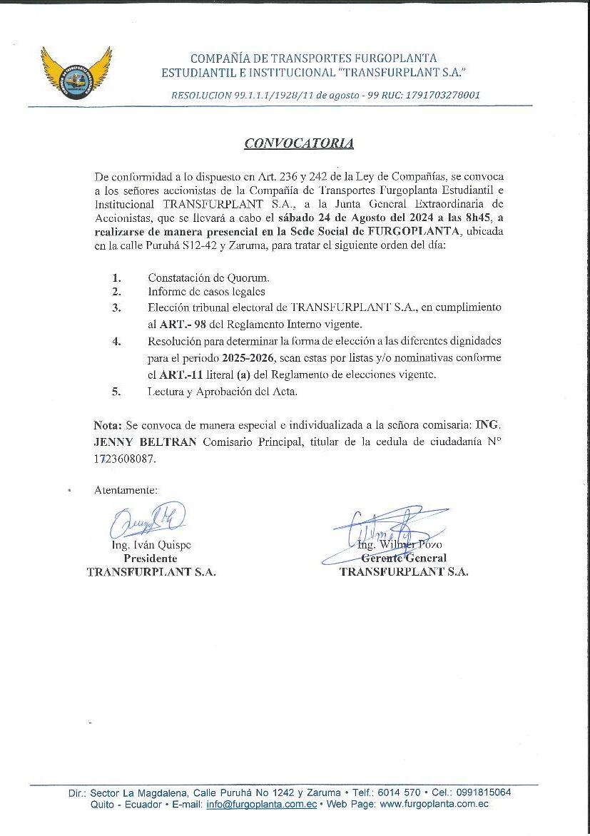 S.A, a la junta general extraordinaria, que se llevará a cabo en el domicilio de la compañía ubicado en la Parroquia de Pifo de este Distrito Metropolitano (casa social del barrio La Primavera) el día viernes 23 de agosto de 2024 a las 17:00, para tratar el siguiente orden del día: