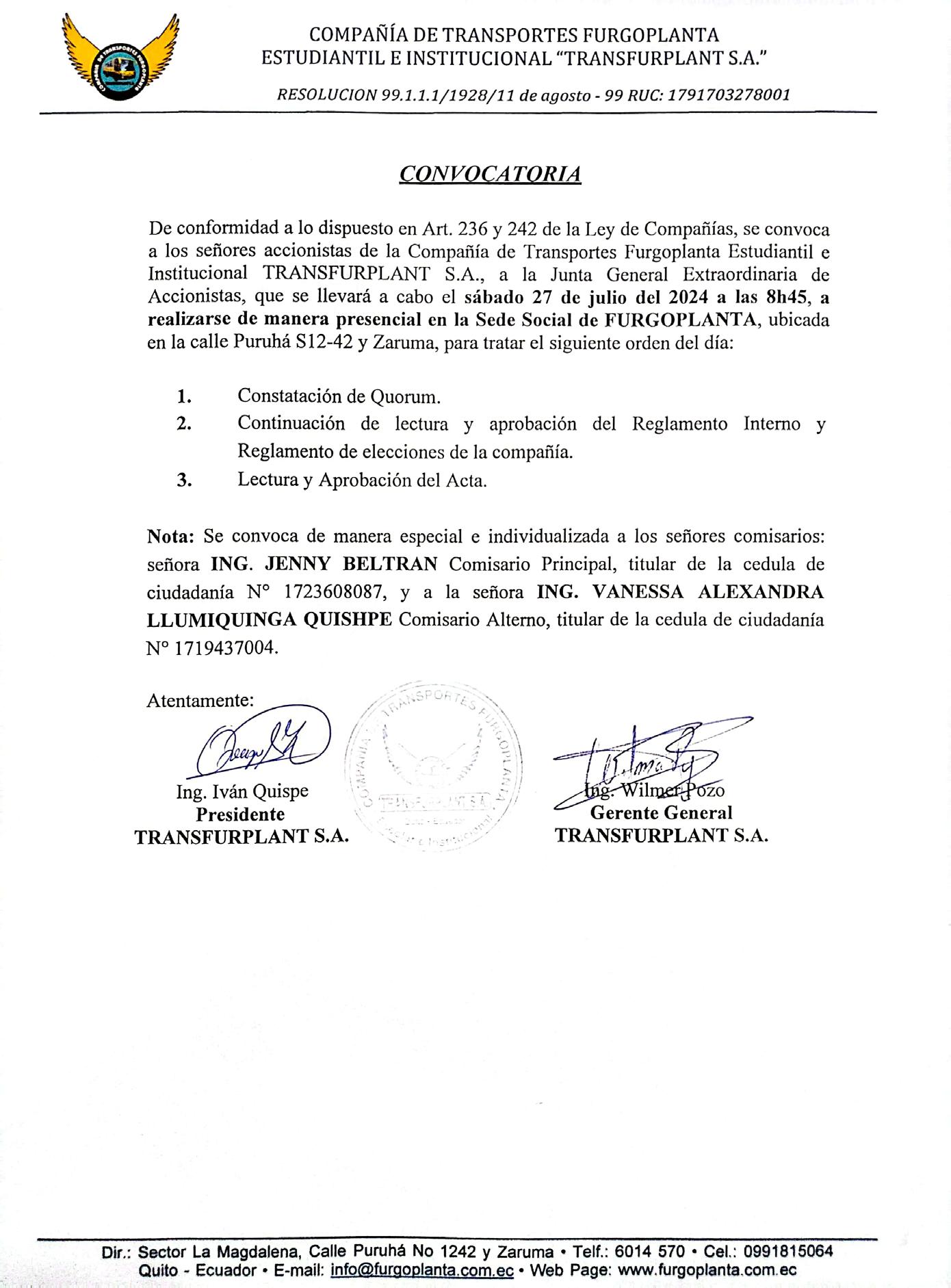 De conformidad con lo dispuesto en la Ley de Compañías en sus artículos 119, 230, 233, 235, 236, el Reglamento sobre Juntas Generales de Socios y Accionistas y el Estatuto Social de la compañía. Se convoca a los señores Accionistas de la COMPAÑÍA SERVICIO ECUATORIANO DE TRANSPORTE SECUATRANS C.A., a Junta General Extraordinaria de Accionistas a celebrarse el día martes 30 de julio del 2024 a las 10h00 horas en el domicilio de la compañía, ubicada en la Av. Rumichaca Ñan S41 y Pasaje A, del cantón Quito, Distrito Metropolitano, para tratar el siguiente Orden Del Día: