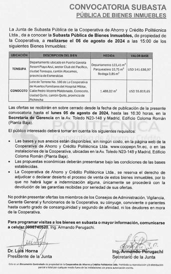 En la ciudad de Quito DM, Provincia de Pichincha a los diez y seis días del mes de julio del 2024, en mi calidad de Presidente de la Asociación de Artistas Profesionales de Pichincha, “AA.PP”. de conformidad a lo dispuesto en los art. 39 literal c; Art. 26 literal f; y, Art. 15 del Estatuto vigente, se CONVOCA todos los socios activos a ASAMBLEA GENERAL ORDINARIA, que se llevará a cabo el día jueves 25 de julio del 2024, a las 17 horas en el Auditorio de la “A.A.P.P”, ubicado en las calles Checa OE2-32 y Manuel Larrea, la misma que se desarrollará bajo las siguientes parámetros: