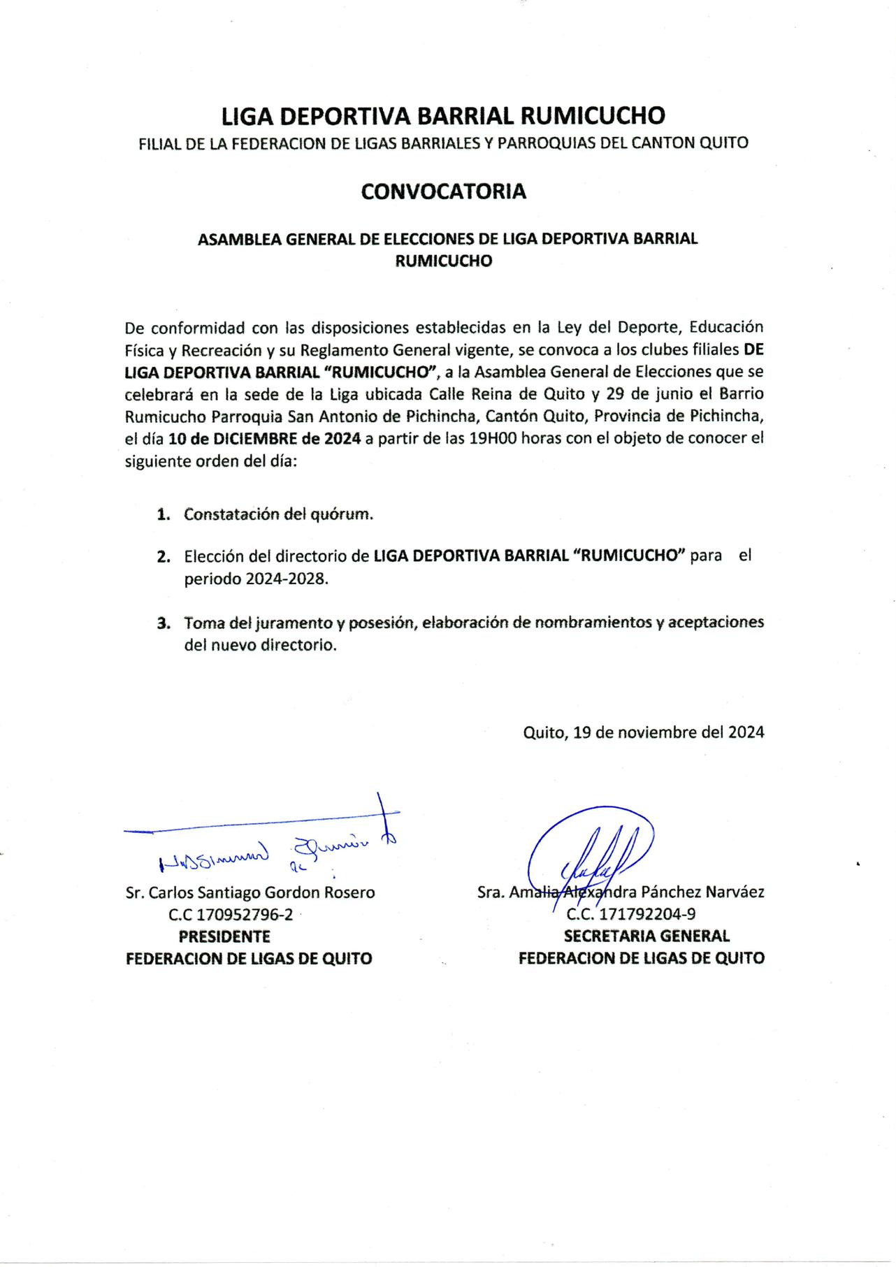 CONVOCATORIA PARA LA ASAMBLEA GENERAL DE ELECCIONES DE LA LIGA DEPORTIVA PARROQUIAL ALANGASI