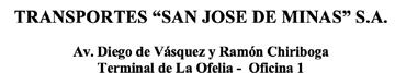 De conformidad a lo dispuesto en el artículo 236 de la Ley de Compañías; el artículo 1 del Reglamento sobre Juntas Generales de Socios y Accionistas; y el articulo Décimo tercero de los Estatutos de la compañía, se convoca a los Señores Accionistas de la compañía Transportes San José de Minas S.A., a la Junta General Extraordinaria, de manera presencial, la misma que se llevará a cabo el día 3 de julio del 2024, a las 10:00 horas, en el domicilio principal y legal de la compañía, ubicada en la calle 27, numero 72 e intersección 22 del barrio Kennedy Baja, referencia a la entrada a La Celica, junto al Mercado Central del cantón Pedro Vicente Maldonado, provincia de Pichincha, en la que se tratará el siguiente orden del día: