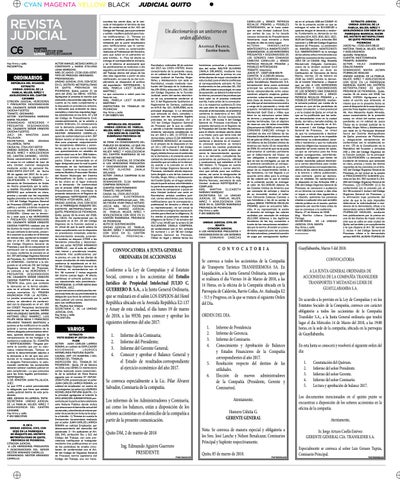 CONVOCATORIA A JUNTA GENERAL ORDINARIA DE ACCIONISTAS Conforme a la Ley de Compañías y al Estatuto Social, convoco a los accionistas del Estudio Jurídico de Propiedad Intelectual JULIO C. GUERRERO B. S.A., a la Junta General Ordinaria, que se realizará en el salón LOS ESPEJOS del Hotel República ubicado en la Avenida República E2-137 y Azuay de esta ciudad, el día lunes 19 de marzo de 2018, a las 9H30, para conocer y aprobar los siguientes informes del año 2017: 1. 2. 3. 4.