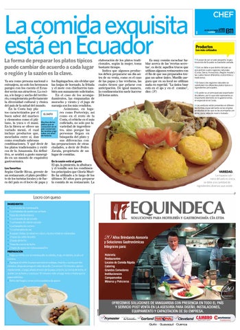 Ya sea como persona nacional o los llapingachos, sin olvidar que extranjera, no solo los hermosos las lonjas de hornado, la fritada parajes con los cuenta el Ecua- y el mote con chicharrón tamdor serán sus atractivos. La coci- bién son sumamente solicitados. En el caso de los acompana, a lo largo y ancho del territorio, complementa perfectamente ñamientos, las empanadas de la diversidad cultural y étnica morocho y viento y el jugo de naranja son los más vendidos. del país de la mitad del mundo. Asimismo, en lugaEn la Costa hay plares como Portoviejo, así tos caracterizados por el EL DATO como en el resto de la buen sabor del marisco Costa, el cebiche es el más y elementos como el pláde los codiciado, no solo por la tano, la yuca o el maní. Muchos platos que se En la Sierra se ofrece un consumen en el variedad de ingredienconservan variado menú, el cual país las recetas origi- tes, sino porque las incluye productos que, nales con años personas llegan en de historia. búsqueda del plato y mezclados entre sí, dan sus diferencias con como resultado sabrosas combinaciones. Y qué decir de las preparaciones de otras los platos tradicionales y exóti- ciudades, a decir de Pedro cos de la Amazonía. En defini- Zavala, propietario de un tiva, se sentirá a gusto sumergi- lugar de comidas. do en un mundo de exquisitez gastronómica. En la sazón está el gusto El ajo, la pimienta, la albahaca y el tomillo son los condimenLos favoritos Según Giselle Rivas, gerente de tos principales que Gloria Muriun restaurante, el plato predilec- llo ha utilizado a lo largo de los to de los turistas locales y de fue- últimos 30 años para preparar ra del país es el locro de papa y la comida de su restaurante. La