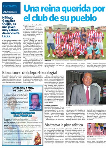 Náthaly González Quijije, es una joven muy estimada en Vuelta Larga. El acto de inauguración del campeonato de fútbol organizado por los barrios del Sur se desarrolló en el estadio ‘Carlos Jorge Castillo Torres’, donde fue elegida como reina de la competencia, Náthaly González Quijije, del equipo de Vuelta Larga. Cuando se le requirió que proporcionara algunos datos acerca de ella, lo hizo con mucho gusto; al final del diálogo se le pedió que posara para la cámara de La Hora, pidiendo hacerlo junto a los jugadores de su comunidad. Los integrantes del plantel ya se habían trasladado a la cancha que está en el interior de la anti-
