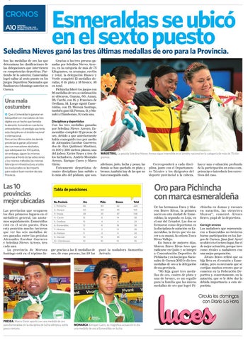 Las 10 provincias mejor ubicadas Las provincias que ocuparon los diez primeros lugares en el medallero general, las anotamos seguidamente. Esmeraldas está en el sexto puesto. Para esta posición mucho tuvieron que ver las seis medallas de oro ganadas entre las pesistas Alexandra Escobar Guerrero y Seledina Nieves Arroyo, tres cada una. La provincia de Morona Santiago está en el séptimo lu-