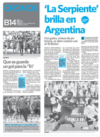 Que se guarde un gol para la ‘Tri’ El México es sinónimo de gol. Lo final del partido, en el Estadio fue con la camiseta del Santos en Alfonso Lastras del San Luis. Un gol que es anheel Apertura de 2010 y relado por la afición ecuapitió con el América en el EL DATO toriana, que espera que Clausura de 2012. Ahora, el ‘Chucho’ se guarde en el Apertura del balomes el pié ‘Azteca’, es el máximo Benítez delantero titular un gol para el juego del próximo 12 de octubre, artillero con siete goles, en de Ecuador. Tiene 26 años y por eliminatorias, ante 11 fechas. su experiencia El séptimo tanto lo ano- ha sido por equi- Chile. pos de México, Con esta victoria, el tó la noche del martes en Inglaterra y jugó el Mundial de América llegó a 18 puntos la victoria 2-1 de las ‘Águi- en Alemania. en once jornadas y el San las’ sobre el San Luis de Luis se quedó relegado Álex Aguinaga. Un tanto que reventó el arco con nueve unidades en el mismo de los ‘potosinos’ en el minuto número de partidos.