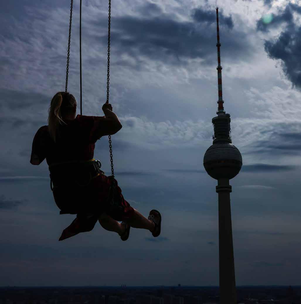 Decenas de personas disfrutan de un columpio a 120 metros de altura sobre la Alexanderplatz, en Berlín, durante el verano. Los visitantes se atan a un arnés de seguridad y se lanzan al vacío por encima de Alexanderplatz, en la azotea de un hotel del centro de la ciudad. EFE