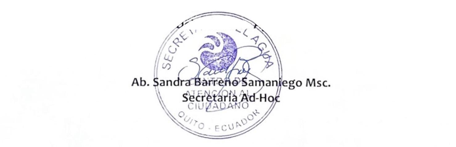 MINISTERIO DEL AMBIENTE, AGUA Y TRANSICION ECOLOGICA, DIRECCION ZONAL 2 ESMERALDAS, OFICINA TECNICA DE QUITO. - Proceso Administrativo No. 45-2023 Aut (SB). - Quito, 14 de junio de 2024. A las 11h30.-VlSTOS: Avoco conocimiento del presente trámite administrativo en mi calidad de Director Zonal de Esmeraldas del Ministerio del Ambiente y Agua, en virtud de la Acción Personal Nio. 365-2023-DZ2-MAATE de fecha 27 de diciembre de 2023. Que mediante Decreto Ejecutivo Nro. 1007 de 04 de marzo de 2020, el Presidente Constitucional de la República decreta la fusión del Ministerio del Ambiente (MAE) y la Secretaría del Agua (Senagua) en una sola institución denominada Ministerio de Ambiente y Agua. Que mediante Acuerdo Ministerial No. MAAE-2023.080, de 20 de agosto de 2023, se aprueba el Estatuto Orgánico del Ministerio del Ambiente, Agua y Transición Ecológica MAATE. En lo principal: Comparece a la Dirección Zonal 2 Esmeraldas, el Ing. Gonzalo Víctor García Freire, en calidad de gerente general de la compañía Florícola San Isidro Labrador FLORSANI S.A.S., de fecha 10 de enero de 2023, solicitando la debida AUTORIZACION para el uso y aprovechamiento, en el caudal de 17,00 1/s. de las aguas subterráneas provenientes del pozo profundo denominado Malchinguí 5, perforado en el lote NO 2 del predio San Isidro, indicado en los antecedentes, de propiedad de la compañía peticionaria, situado en la Parroquia Malchinguí, Cantón Pedro Moncayo, Provincia de Pichincha, para destinarlas a riego de las actividades productivas de la agroindustria de exportación. Autoriza al Dr. Guillermo Narváez suscriba los escritos necesarios en la presente causa. Señala los correos electrónicos: dpazmay@florsani.com, tramitessenagua@yahoo.com, para sus notificaciones. Con estos antecedentes esta Autoridad Administrativa Dispone 1.- Se acepta la solicitud y en apego a lo dispuesto en los Arts. 57, 58,71, 86, 90, 94, 95, 123 y 126 de la Ley Orgánica de los Recursos Hídricos Usos y Aprovechamientos del Agua, en concordancia con lo prescrito en el Art. 107 del Reglamento, se la califica a trámite, por el procedimiento General. 2.- Por lo dispuesto en el Art. 107 numeral 3 del Reglamento a la Ley Orgánica de Recurso Hídricos. Notifíquese con la solicitud y la presente providencia a los usuarios conocidos y desconocidos mediante publicación de un extracto de la solicitud y esta providencia, publicaciones que se lo deberá realizar en un periódico de circulación de la localidad, de no existir se lo realizará en un periódico de circulación nacional, por tres veces consecutivas; y, fíjese carteles durante diez días consecutivos en tres lugares más concurridos de la parroquia Malchingui, cantón Pedro Moncayo, provincia de Pichincha. 3.Téngase en cuenta los correos electrónicos dpazmay@florsani.com, tramitessenagua@ yahoo.com, de conformidad a lo dispuesto en los Arts. 2 y 56 de la Ley de Comercio Electrónico, Firmas y Mensajes de Datos, en concordancia con el Art. 165 del Código Orgánico Administrativo COA. 4. Previniéndole que en caso de no realizarse la misma, por cuestiones imputables al administrado, y transcurrido el plazo de dos meses se declara el abandono y posterior archivo de conformidad al Art. 212 del Código Orgánico Administrativo. Actúe como Secretaria Ad-Hoc, en el presente trámite Ab. Sandra Barreno Samaniego Msc.