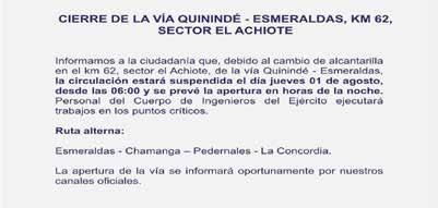 que las autoridades respeten los horarios y difundan que si se puede llegar a Esmeraldas por las otras rutas existentes como es la Quito- Ibarra-Esmeraldas o la ruta del spondylus, que comprende el sur de Esmeraldas ingresando por el hermano cantón de Pedernales. DLH foto Comunicado del Ministerio de Transporte
