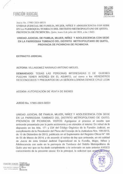 del Código Orgánico General de Procesos.- En consecuencia, se dispone: 1) De conformidad con lo determinado en el Art. 60 del Código Orgánico de la Niñez y Adolescencia se convoca a MARTINA VILLAGOMEZ CRUZ, a fin de que sea escuchado de forma reservada por ésta Unidad Judicial el día 10 DE SEPTIEMBRE DE 2024 LAS 12H00 y emita su opinión. 2) De conformidad con el artículo 335, último inciso, del Código Orgánico General de Procesos, de acuerdo a la carga procesal, a la agenda de ésta Unidad Judicial, se convoca a la AUDIENCIA respectiva para el día 10 DE SEPTIEMBRE DE 2024, LAS 12H05, a la que comparecerán los peticionarios, los testigos anunciados acompañados de la defensa técnica, bajo prevenciones de lo dispuesto en los artículos 87 y 286.1 del Código Orgánico General de Procesos y los artículos 131.4 y 132.1 del Código Orgánico de la Función Judicial.- 3) Con relación a la prueba anunciada: 3.1) De ser procedente y conforme a derecho se tendrá en cuenta la prueba documental; 3.2) De ser procedente y conforme a derecho se tendrá en cuenta la prueba testimonial anunciada de conformidad con el artículo 174, 187 y 188 del Código Orgánico General de Procesos.- 3) Agréguese al proceso la documentación que acompañan a la demanda. 4) Se ordena la CITACIÓN DE TODAS LAS PERSONAS INTERESADAS O DE QUIENES PUEDAN TENER INTERÉS EN EL ASUNTO, así como a los HEREDEROS DESCONOCIDOS Y PRESUNTOS DE LA SEÑORA LORENA DENICE CRUZ LEON para lo cual se realizarán las publicaciones en un medio de comunicación a elección de la accionante, conforme art. 56 del COGEP, bajo prevención que, de hacerlo de forma digital se proceda a cumplir con lo que señalan los art. 18 de la Ley Notarial y 4 y 5 del Reglamento a la Ley de Comercio Electrónico, Firmas Electrónicas y Mensajes de Datos, para lo cual, entréguense los extractos correspondientes, ordenando a la parte interesada realice las publicaciones con el suficiente tiempo a fin de cumplir con los tiempos procesales previo la instalación de audiencia conforme art. 56 del COGEP, recordando que la citación es una solemnidad sustancial dentro de los procesos judiciales y la audiencia se convoca con el suficiente tiempo para cumplir con lo dispuesto, siendo estricta responsabilidad de la parte el cumplimiento de la disposición judicial. 5) Tómese en cuenta el Domicilio judicial que señalan los accionantes para sus notificaciones, así como la autorización que confieren a su abogado defensor. 6) La convocatoria a la audiencia se realiza bajo prevenciones del Art. 131 numeral 4 del Código Orgánico de la Función Judicial; Arts. 87, 261 numeral 1 del Código Orgánico General de Procesos.- NOTIFIQUESE y CÚMPLASE.-