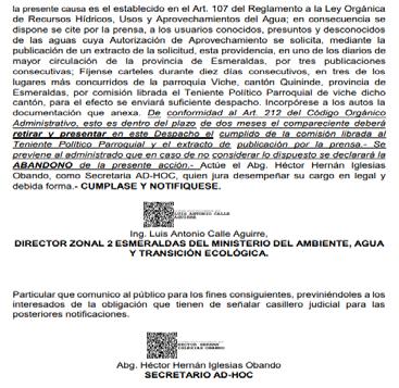 ZONAL 2 DEL MINISTERIO DEL AMBIENTE, AGUA Y TRANSICIÓN ECOLÓGICA, ESMERALDAS CITACIÓN A LOS USUARIOS CONOCIDOS O NO DEL RIO ESMERALDAS, UBICADA EN LA PARROQUIA VICHE, CANTÓN QUINENDE, EL CAUDAL SOLICITADO SERÁ DE 45 L/S, PARA UN TOTAL DE 1622 BENEFICIARIOS. DICHAS AGUAS ESTÁN UBICADAS EN LA PARROQUIA VICHE, CANTÓN QUININDE, PROVINCIA DE ESMERALDAS.