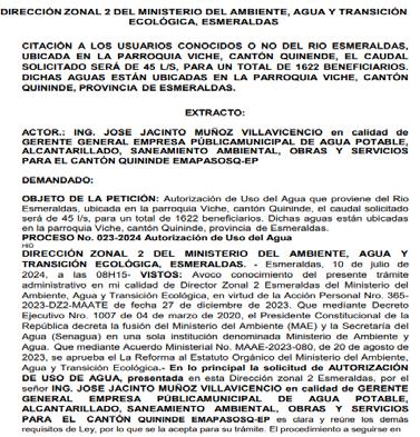 DEMANDADO: OBJETO DE LA PETICIÓN: Autorización de Uso del Esmeraldas ubicada en la parroquia Viche, cantón Quininde, el caudal solicitado será de 45 l/s, para un total de 1622 beneficiarios. Dichas aguas están ubicadas en la parroquia Viche, cantón Quininde, provincia PROCESO No. 023-2024 Autorización de Uso HIO DIRECCIÓN ZONAL 2 DEL MINISTERIO TRANSICIÓN ECOLÓGICA, ESMERALDAS. 2024, a las 08H15- VISTOS: Avoco conocimiento del presente trámite administrativo en mi calidad de Director Zonal 2 Esmeraldas del Ministerio del Ambiente, Agua y Transición Ecológica, en virtud de la Acción Personal Nro. 365 2023-DZ2-MAATE de fecha 27 de diciembre de 2023. Que medi Ejecutivo Nro. 1007 de 04 de marzo de 2020, República decreta la fusión del Ministerio del Ambiente (MAE) y la Secretaría del Agua (Senagua) en una sola institución denominada Ministerio de Ambiente y Agua. Que mediante Acuerdo Ministerial No. MAAE 2023, se aprueba el La Reforma al Estatuto Orgánico del Ministerio del Ambiente, Agua y Transición Ecológica - En lo principal la solicitud de AUTORIZACIÓN DE USO DE AGUA, presentada en esta Dirección zonal 2 Esmeraldas, por el señor ING. JOSE JACINTO MUÑOZ VILLAVICENCIO en calidad de GERENTE GENERAL EMPRESA PÚBLICAMUNICIPAL DE AGUA POTABLE, ALCANTARILLADO, SANEAMIENTO AMBIENTAL, PARA EL CANTÓN QUININDE EMAPASOSQ requisitos de Ley, por lo que se la acepta para su trámite.