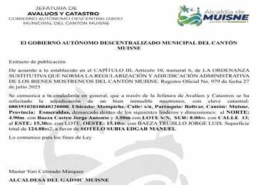 JEFATURA DE AVALUOS Y CATASTRO GOBIERNO AUTÓNOMO DESCENTRALIZADO MUNICIPAL DEL CANTÓN MUISNE El GOBIERNO AUTÓNOMO DESCENTRALIZADO MUNICIPAL DEL CANTÓN MUISNE Extracto de publicación De acuerdo a lo establecido en el CAPÍTULO III, Artículo 10, numeral 6, de LA ORDENANZA SUSTITUTIVA QUE NORMA LA REGULARIZACIÓN Y ADJUDICACIÓN ADMINISTRATIVA DE LOS BIENES MOSTRENCOS DEL CANTÓN MUISNE. Registro Oficial No. 979 de fecha 27 de julio 2023 Se comunica a la ciudadanía en general, que a través de la Jefatura de Avalúos y Catastros se ha solicitado la adjudicación de un bien inmueble mostrenco, con clave catastral: 0803500107010022000 Ubicado: Nuevo Muisne. Calle: S/N Parroquia: MUISNE, Cantón: Muisne, Provincia: Esmeraldas, demarcado dentro de los siguientes linderos y dimensiones: al NORTE: 21 53m. con EDGAR SEGURA SUR: 19.47m. con ALIRIO CARRILLO; al ESTE: 7.39m. con ÀREAS VERDES OESTE: 7.30m. con VÌA MUISNE- ESMERALDA. Superficie total de 148.64 m2, a favor de MARCOS PATRICIO CARRILLO TUFIÑO Lo comunico para los fines de Ley Master Yuri Colorado Márquez ALCALDESA DEL GADMC MUISNE