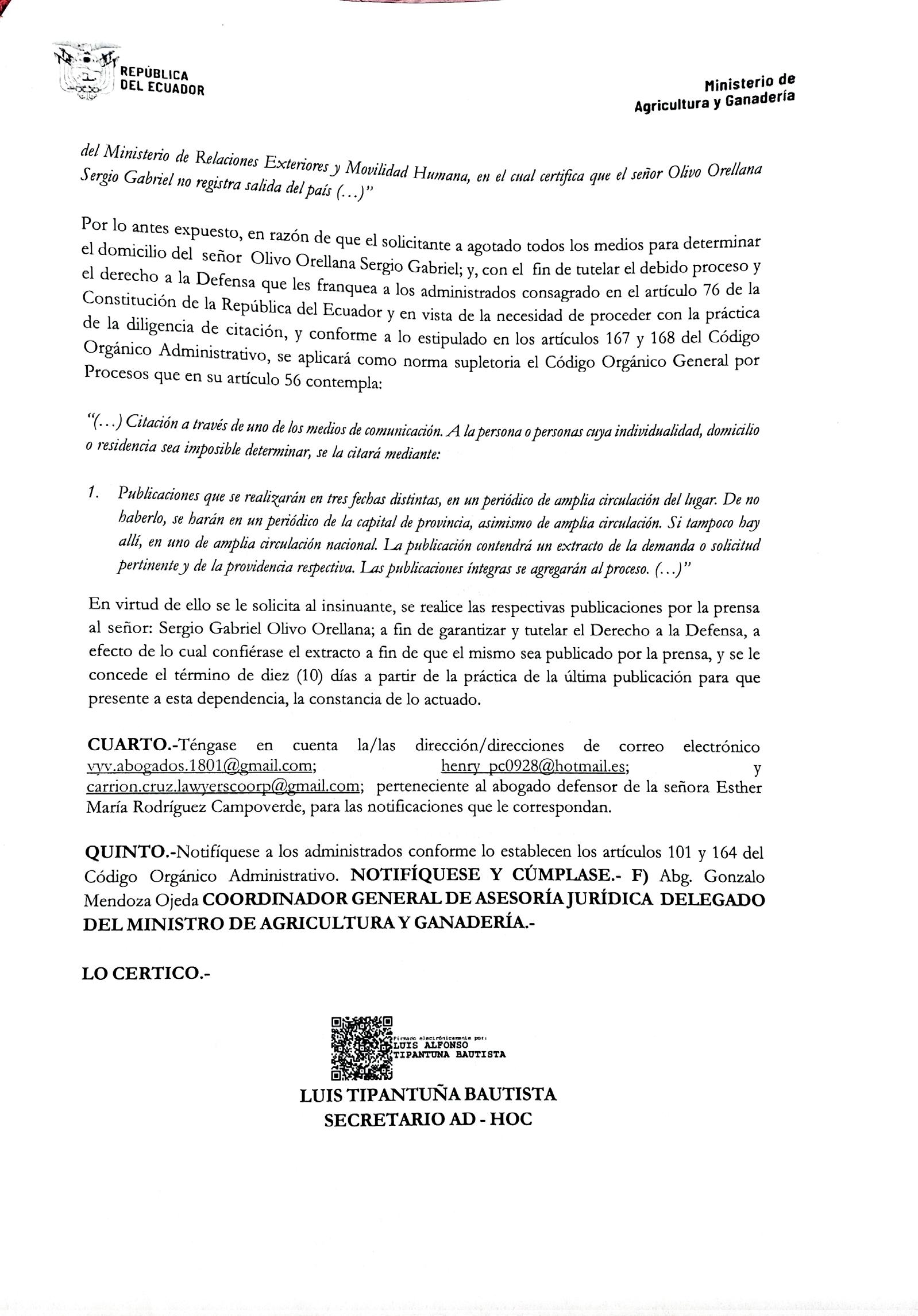 Escrito Nº MAG-CGAF-ADGDA-2023-14028-E de 09 de agosto de 2023, ingresado por la señora Esther María Rodríguez Campoverde, mediante el cual solicita: Sergio Gabriel a través de un medio de comunicación conforma lo determina la normativa el Código Orgánico Administrativo a través de dos (2) publicaciones, para el efecto, usted como autoridad, sírvase en emitir los extractos
