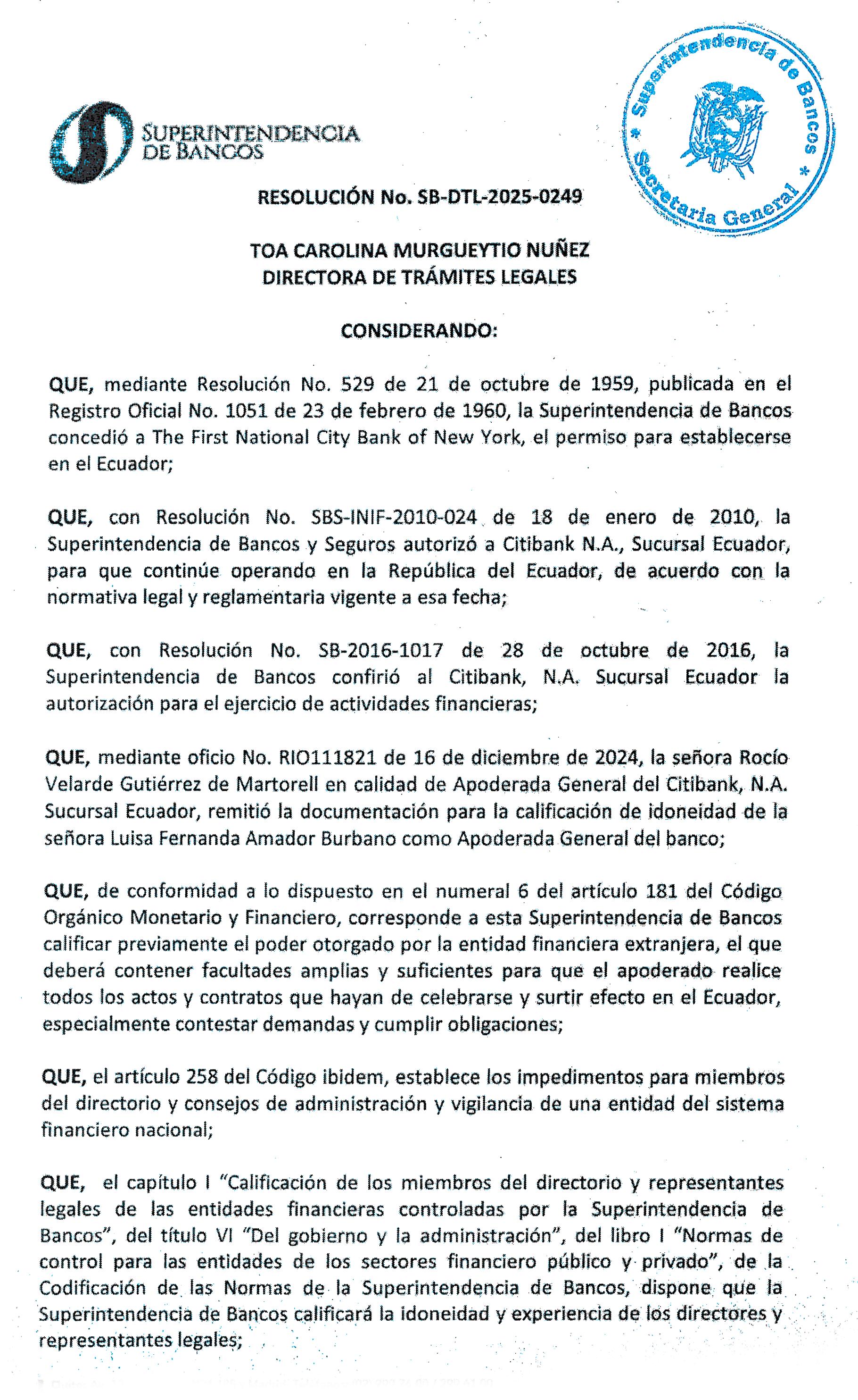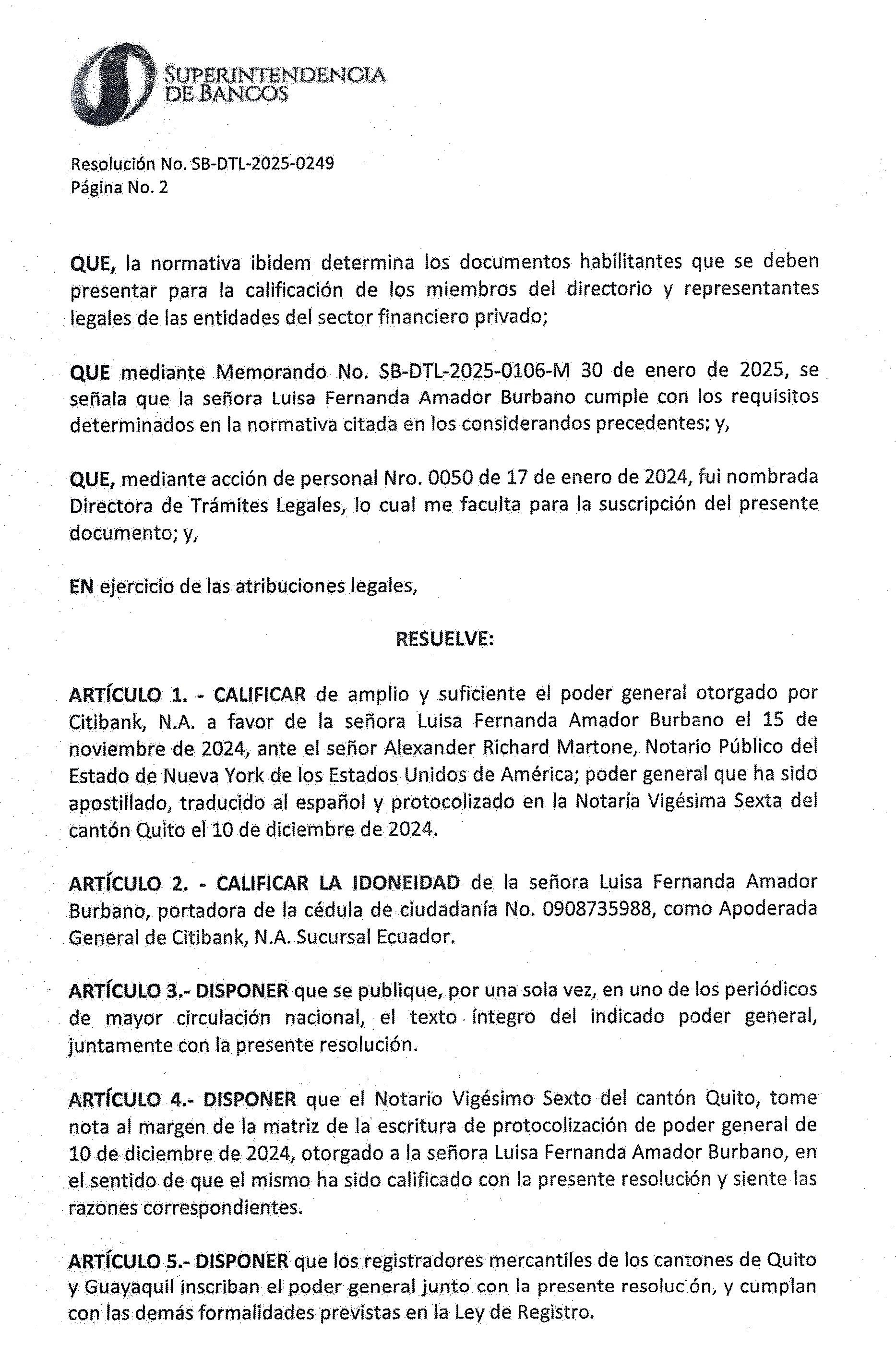 El Banco por este medio designa a Luisa Fernanda Amador Burbano, mujer, mayor de edad, con cédula ecuatoriana No. 0908735988 al momento reside en Ecuador, como Ejecutiva Principal para Ecuador (el “País de Referencia”) y como verdadero y legítimo apoderado con facultades generales (Apoderado General) del Banco en el Ecuador (el “País de Referencia”) con poder amplio y suficiente, tal como es necesario en derecho, con las facultades requeridas por las leyes del país de referencia para este tipo de poder y con el propósito de representar legalmente al Banco, para realizar lo siguiente: