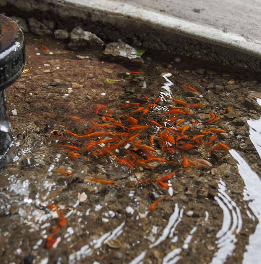 Unos peces de colores nadan en el agua que se ha escapado de una boca de riego en una acera del barrio de Brooklyn en Nueva York, Estados Unidos, el 9 de agosto de 2024. EFE