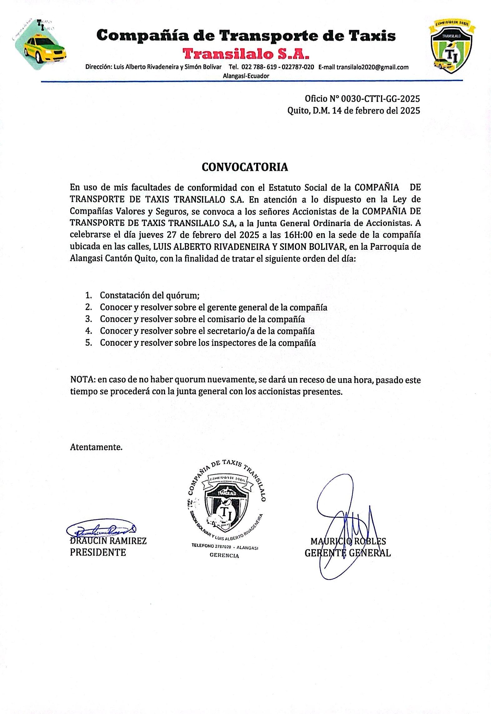 Se convoca a la Junta General Ordinaria de Accionistas de la Compañía Gráficas Ayerve C.A., que se llevará a cabo el 26 de febrero de 2025, a las 10h00 horas, en sus oficinas ubicadas en las calles, Galo Plaza Lasso N46-148 e Isaac Albéniz, de conformidad con los Estatutos de la empresa.