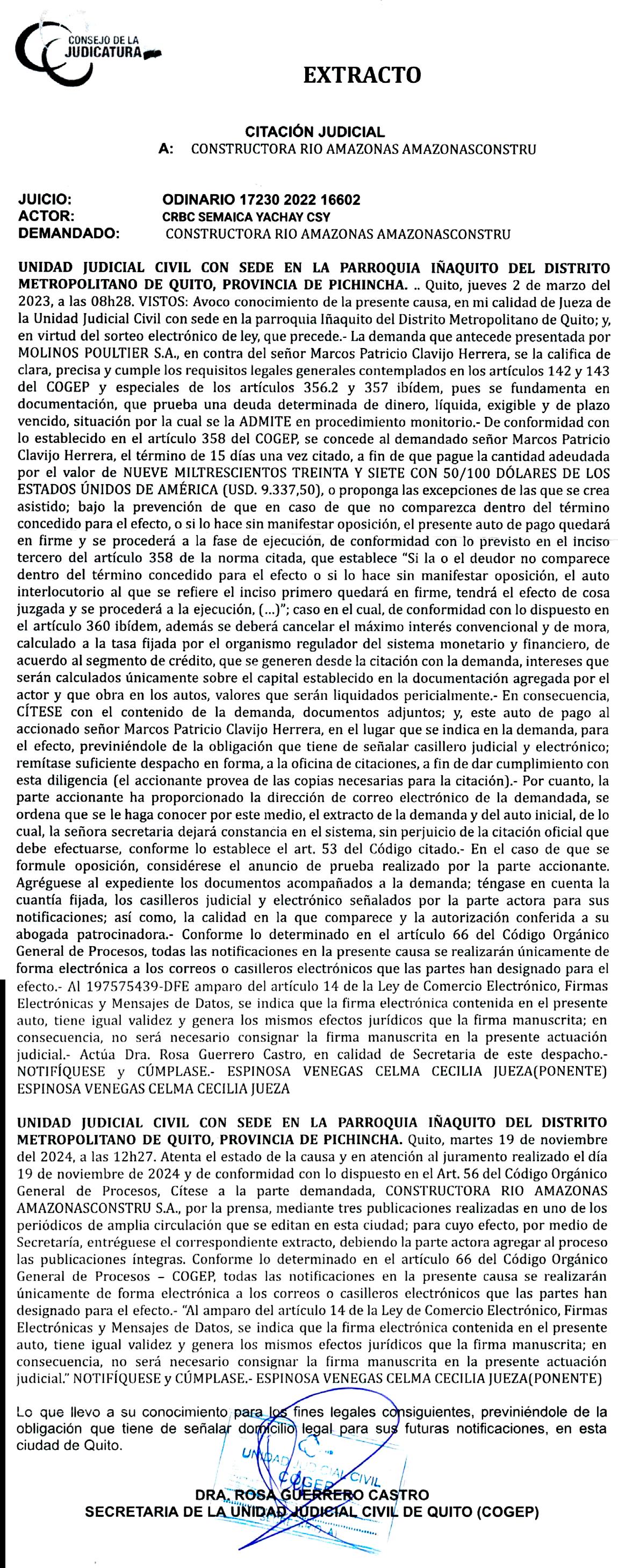 UNIDAD JUDICIAL DE LO CIVIL CON SEDE EN EL CANTON RUMIÑAHUI, PROVINCIA DE PICHINCHA.- Rumiñahui, 7 de marzo del 2024, las 16h23VISTOS: Agréguese al proceso el escrito que antecede. En lo principal: 1) Incorpórese al proceso la razón de inscripción de la demanda, para los fines legales pertinentes. 2) CITACIÓN POR LA PRENSA: Atendiendo lo solicitado por la parte actora y por haber dado la declaración bajo juramento de que es imposible determinar la individualidad, el domicilio o residencia de los herederos desconocidos cuya residencia sea imposible determinar, de conformidad con lo que establecen los Arts. 56 y 68.1 del COGEP, CÍTESE a HEREDEROS DESCONOCIDOS DE LOS DEMANDADOS FALLECIDOS: LOS CONYUGES LUIS ANTONIO ROBALINO DAVILA Y SOFIA GERTRUDIS ELSBETH BOLLE WERNER; ASÍ COMO A LOS HEREDEROS DESCONOCIDOS DE SU HIJA, ÚNICA HEREDERA CONOCIDA TAMBIÉN FALLECIDA ISABEL MARIA JOSEFINA ROBALINO BOLLE, POR NO TENER HEREDEROS CONOCIDOS. Para el efecto, por Secretaría emítase el extracto con el que deberá ser citada el mismo que contendrá un resumen de la demanda o solicitud pertinente, de la calificación de la demanda y de la providencia respectiva y que deberá ser publicado en tres fechas distintas, en un periódico de amplia circulación del lugar. Para el efecto, una vez ejecutoriada esta providencia, y cuando aparezca visible en el módulo de Consulta de Causas de la Función Judicial, el accionante comparezca al Archivo de esta Unidad Judicial (Av. General Rumiñahui N11-57 e Isla Baltra, edificio Ponce, planta baja) en días y horas hábiles para retirar el mencionado extracto. De conformidad con lo preceptuado en el artículo 14 de la Ley de Comercio Electrónico, Firmas y Mensajes de Datos se informa a las partes procesales que, las firmas electrónicas constantes en el presente auto, tienen igual validez y generan los mismos efectos jurídicos de la firma manuscrita, en consecuencia es innecesario suscribirlo manualmente. Actúe la Dra. Doris Vinocuna en calidad de secretaria titular de esta judicatura.- NOTIFÍQUESE.- f) Juez