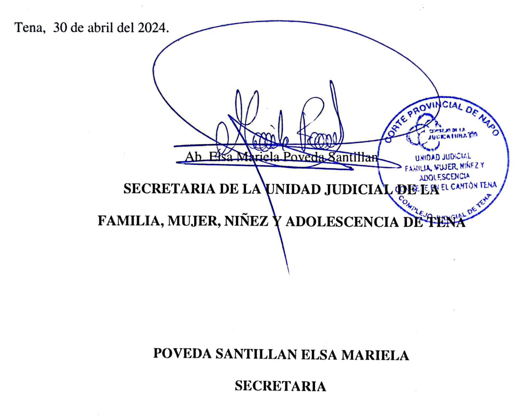 UNIDAD JUDICIAL DE FAMILIA, MUJER, NIÑEZ Y ADOLESCENCIA CON SEDE EN EL CANTÓN TENA. Tena, martes 30 de abril del 2024, a las 11h36.