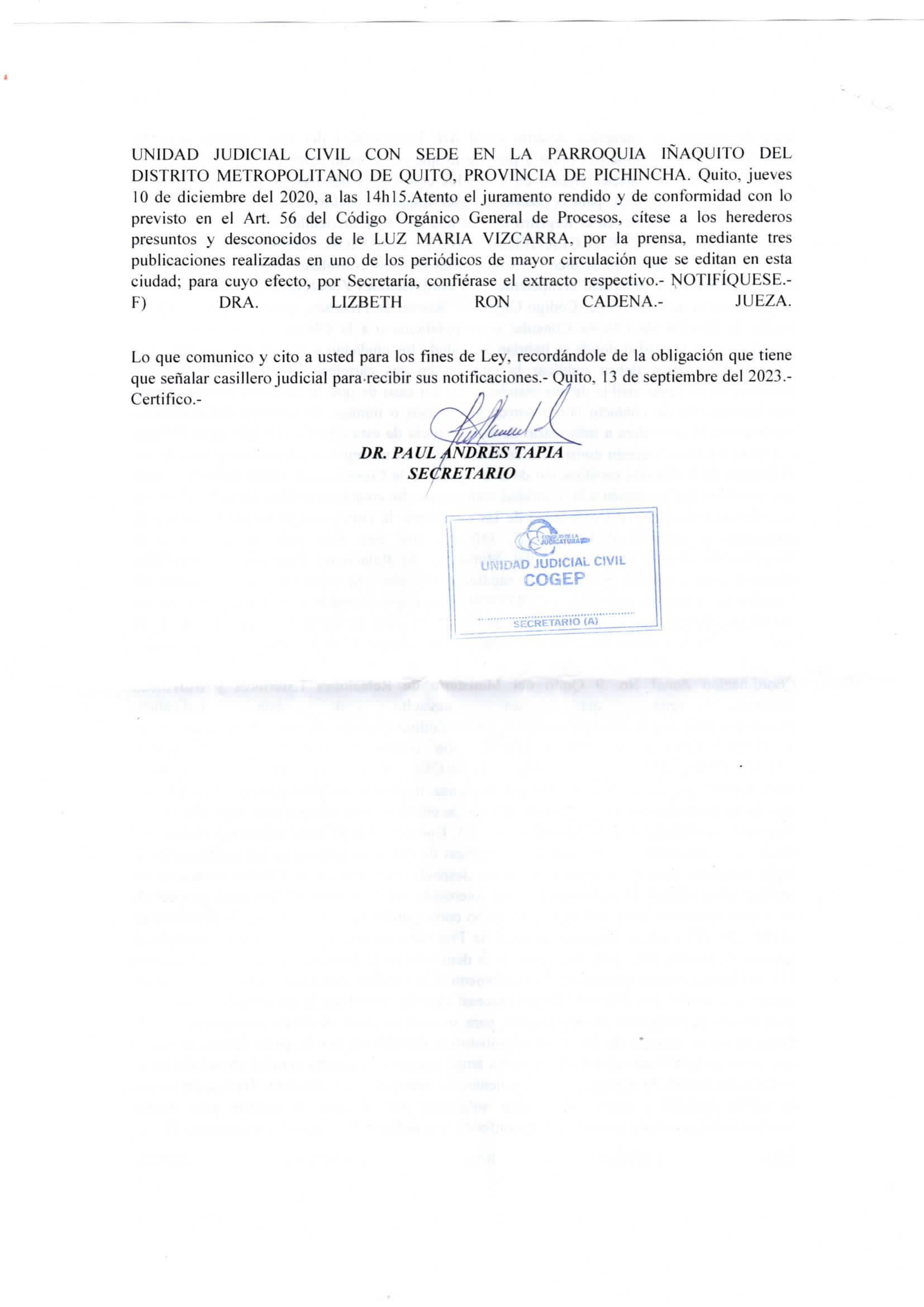 UNIDAD JUDICIALCIVILCON SEDE EN LAPARROQUIAIÑAQUITO DELDISTRITO METROPOLITANO DE QUITO, PROVINCIADE PICHINCHA.Quito, jueves 10 de diciembre del 2020, a las 14h15.Atento el juramento rendido y de conformidad con lo previsto en el Art. 56 del Código Orgánico General de Procesos, cítese a los herederos presuntos y desconocidos de le LUZ MARIA VIZCARRA, por la prensa, mediante tres publicaciones realizadas en uno de los periódicos de mayor circulación que se editan en esta ciudad; para cuyo efecto, por Secretaría, confiérase el extracto respectivo.- NOTIFÍQUESE.F) DRA. LIZBETH RON CADENA.- JUEZA.