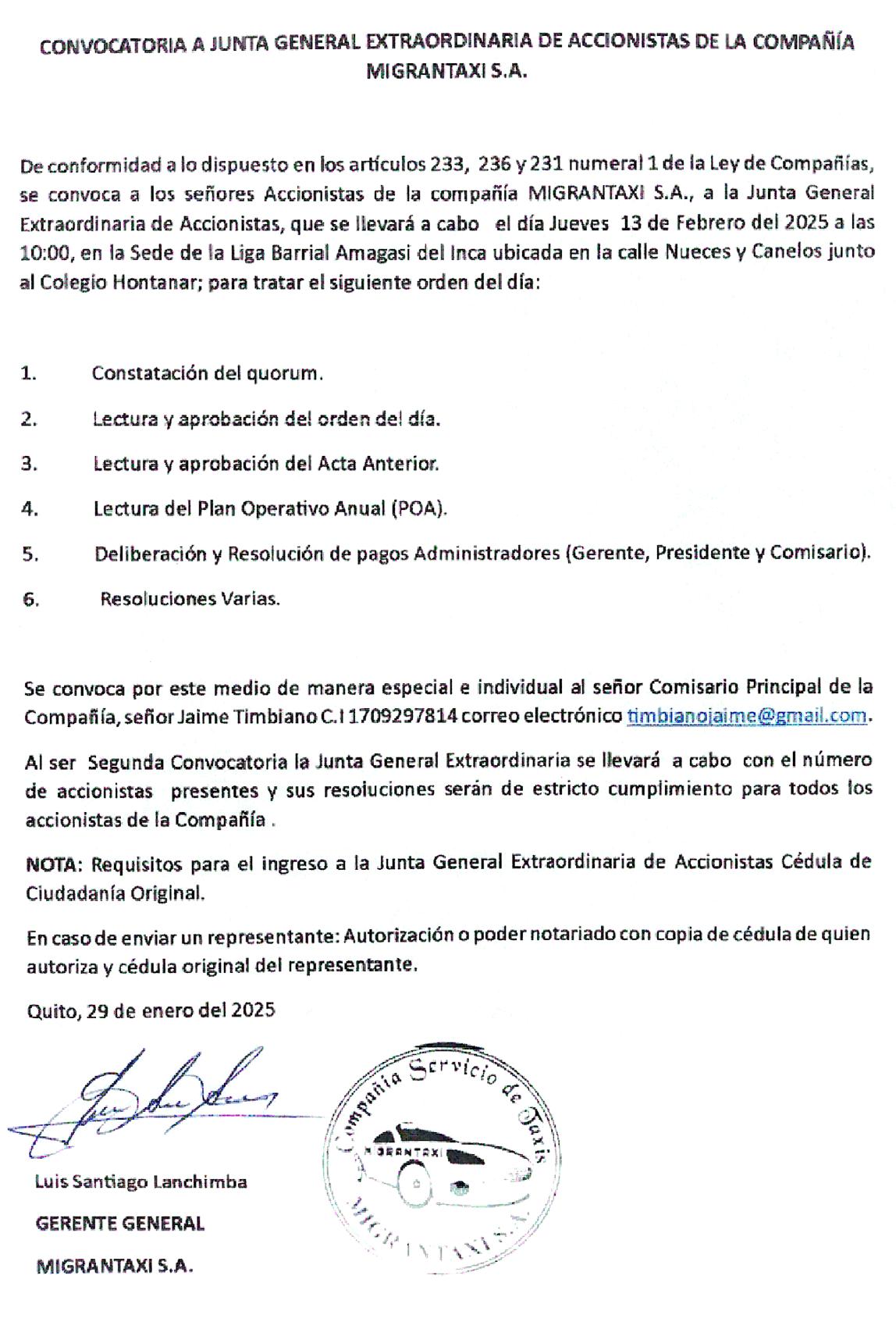 Dando cumplimiento a lo estipulado en la Ley de la Superintendencia de Compañías y los Reglamentos internos de la COMPAÑÍA DE VOLQUETAS Y TRANSPORTE CAMINERO CORDIMBA S.A., mediante la presente se CONVOCA, con carácter de urgente y obligatorio a una Junta General Extraordinaria de Accionistas, a realizarse el día Viernes 31 de Enero del 2025, a las 18:00 pm. en la Ciudadela Pilanqui del IESS, (Detrás del Centro Comercial Laguna Mall – Sede de Jubilados). Para tratar el siguiente orden del día.