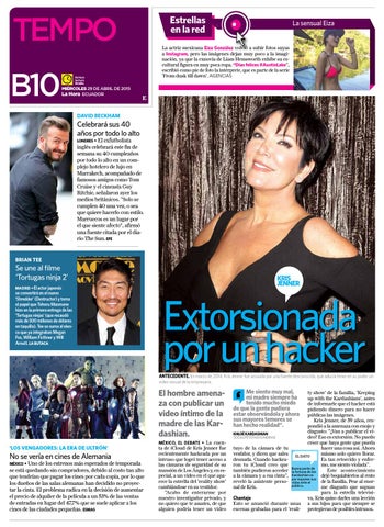 ty show’ de la familia, ‘Keeping up with the Kardashians’, antes de informarle que el hacker está pidiendo dinero para no hacer públicas las imágenes. Kris Jenner, de 59 años, respondió a la amenaza con enojo y disgusto: “¿Van a publicar el viKHLOÉ KARDASHIAN ‘SOCIALITÉ’ ESTADOUNIDENSE deo? Eso es extorsión. No puedo creer que haya gente que pueda hacer una cosa así. Ahora tuyo de la cámara de tu mismo solo quiero llorar. vestidor, y dicen que sales EL DATO Es tan retorcido y enferdesnuda. Cuando hackeamo, me siento violada”. ron tu iCloud creo que parte de Este acontecimiento también pudieron acceder Buena la fortuna de los dejó boquiabiertos al resto a la cámara y a esa cinta”, Kardashian es por exponer sus de la familia. Pese al enorreveló la asistente perso- vidas ante el público. me disgusto que supuso nal de Kris. para la estrella televisiva, Kris quiso darles una lección Chantaje Esto se anunció durante unas a sus hijos para que siempre se escenas grabadas para el ‘reali- protegieran de posibles intrusos.