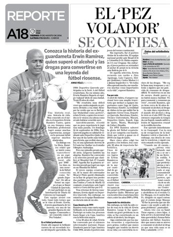 clavo de las drogas. “Me cogió la fama muy temprano y caí. No tenía a alguien que me guíe. La vida de consumo de drogas es difícil. Te encierras en un mundo oscuro, donde parece que Fue por más A nivel de clubes, el arquero na- no habrá nunca claridad. Vives cional tuvo una amplia trayec- para consumir y consumes para toria que incluyó a equipos im- vivir”, recordó Ramírez, quien portantes como Liga de Quito, ya tiene cerca de 16 años de no Barcelona y Emelec. La totalidad consumir ni alcohol, ni drogas. La más dura experiencia en de clubes en los que militó fue la siguiente: Green Cross, Deporti- el mundo del alcohol y drogas vo Quevedo, Barcelona, Emelec, la vivió en el año 1997. En aquel Técnico Universitario, Macará, entonces empezaba la temporaDeportivo Quito, Espoli, Liga da con Espoli, cuando sufrió una de Quito, Manta, Municipal lesión de ligamentos cruzados en la rodilla derecha. de Cañar y Brasilia. Fue operado inmediatamenEn 1993 Ramírez saboreó la gloria del fútbol ecuatoria- te en Guayaquil. Con la excuno al ser campeón con Emelec, sa de recuperarse de la lesión, título que volvió a ganar en el Ramírez volvió a Quevedo. Sin embargo, sus deseos de consu2003 con Liga de Quito. Hace cinco años colgó los mir lo vencieron, y siguió con el guantes y los botines, tras cum- vicio estando recién operado. “Cuando me di cuenta mi plir 22 años de trayectoria futpierna estaba bolística. botando mateUnos de ria y se me salos mayolía un fierro de res logros la rodilla. Me de Erwin asusté. Pensé Ramírez es que perdería mi ser autor pierna y tal vez de la maeso hubiera payor cantisado si seguía dad de goconsumiendo”, les que ha relató el exconvertido portero, quien un arquero tomó concienen el fútbol cia de su situaecuatoriano. CARRERA. Fue guardameta en varios ción y entró a Anotó cua- equipos importantes del país. un Centro de tro tantos de tiro penal en 1994 jugando para Rehabilitación para drogadictos Deportivo Quito. Mientras que y alcohólicos en el recinto Cuacon la selección ecuatoriana hizo tro Mangas, en el cantón Buena cinco, entre los años 1989 y 1994. Fe, dirigido en aquel entonces por el extinto Jorge Manzano. “Él fue la persona que me dio la Superando los obstáculos Sin embargo, no todo ha sido co- mano y me ayudó a salir de mi lor de rosa en la vida de Erwin gran problema”, puntualizó. Ahora vive con su familia. Ramírez. Luego le fue apareciendo un grave problema en su Tiene esposa y cinco hijos. Anvida: se fue convirtiendo en un hela servir a la juventud deportista quevedeña y formar futuros adicto al alcohol y las drogas. Algo entristecido por los ma- talentos del fútbol. Sonriente, los recuerdos y experiencias dice que nunca más se atrevería poco gratas, confesó que nunca a consumir ni alcohol ni drogas, imaginó que tendría un desvío ya que una vida sana es más en su vida y se convertiría en es- feliz y saludable. (JVV)