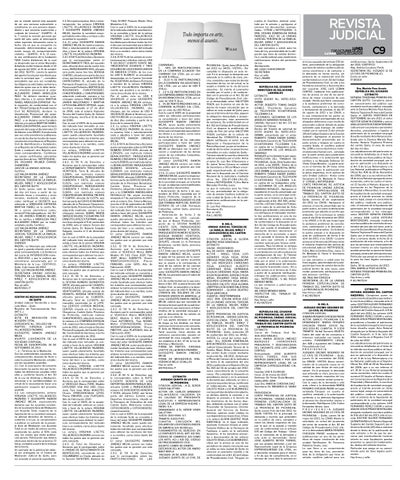 Revista judicial LUNES 7 de OCTUBRE de 2013 La Hora Quito, ecuador el inciso segundo del artículo 576 ibídem, previniéndole de la obligación que tiene de señalar casillero judicial, correo electrónico y de contestar a la demanda en forma escrita, sin perjuicio de su exposición oral.-De conformidad con el art. 82 del Código de Procedimiento Civil, se cite a los herederos presuntos y desconocidos del causante JOSE LUIS LERMA CORTEZ, mediante tres publicaciones de prensa en uno de los periódicos de mayor circulación de esta ciudad.- Hecho que fuere, convocase a la audiencia preliminar de conciliación, contestación a la demanda y formulación de pruebas, el día 07 de agosto de 2013 a las 15h00, a la que comparecerán las partes en forma personal acompañados de sus abogados defensores o por medio de procurador judicial dotado de poder suficiente para transigir, de conformidad con el numeral 11 del artículo 130 del Código Orgánico de la Función Judicial.- Agréguese al proceso la documentación presentada por la parte actora y téngase en cuenta la cuantía fijada, el casillero judicial No. 2298 y correo electrónico victorchalamorales@gmail.com , señalado por la parte actora para posteriores notificaciones y la autorización que confiere a su Abogado Defensor Dr. Víctor Chala Morales.- La parte actora en el término de 24 horas retire el extracto para la publicación por la presa respectivo, en el archivo de esta Unidad Judicial.- Actúa como Secretario el Dr. Medardo A. Yánez V.- CÍTESE y NOTIFÍQUESE.CORTE PROVINCIAL DE JUSTICIA DE PICHINCHA. UNIDAD JUDICIAL PRIMERA ESPECIALIZADA DE TRABAJO DEL CANTON QUITO DE LA PROVINCIA DE PICHINCHA. Quito, viernes 13 de septiembre del 2013, las 15h06.- Agréguese al proceso el escrito presentado por la parte actora, así como la declaración juramenta que adjunta al escrito que antecede.- En lo principal se señala para el día 18 de diciembre del 2013, a las 14h00, a fin de que tenga lugar la audiencia preliminar de conciliación, contestación a la demanda y formulación de pruebas.- En lo demás la partes estarán a lo dispuesto en auto de calificación de fecha 4 de abril del 2013, a las 11h28.- La parte actora en el término de 24 horas retire el extracto respectivo del archivo de esta Unidad Judicial.- NOTIFIQUESE. f) Dra. Marcia Córdova Díaz, Jueza. F) Dr. Medardo A. Yánez V. Secretario que Certifica. Lo que comunico a usted para los fines legales, advirtiéndole de la obligación que tiene de señalar domicilio judicial dentro de esta causa, para recibir posteriores notificaciones en este proceso.- certifica.AB. PAULINA FONSECA SECRETARIA (E) DE LA UNIDAD PRIMERA ESPECIALIZADA DE TRABAJO DEL CANTON QUITO DE LA PROVINCIA DE PICHINCHA. Hay firma y sello P AC/96708/tf R. DEL E. JUZGADO DECIMO SEGUNDO DE LO CIVIL DE PICHINCHA CITACION JUDICIAL A MARIA ROSARIO CHICAIZA PASSE ACTOR: BANCO PICHINCHA C.A. DEMANDADO: MARIA ROSARIO CHICAIZA PASSE JUICIO No. 1412-2010-RE CUANTIA: $ 6.500 TRAMITE: Verbal Sumario OBJETO: Cobro del valor de los consumos e intereses realizados con tarjeta de crédito. FUNDAMENTO LEGAL: Art. 828 y siguientes del Código de Procedimiento Civil. PROVIDENCIA JUZGADO DECIMO SEGUNDO DE LO CIVIL DE PICHINCHA .- Quito, jueves 11 de noviembre del 2010, las 09h08.- VISTOS: Avoco conocimiento de la presente causa en mi calidad de juez titular de esta judicatura.- En lo principal, la demanda que antecede es clara, precisa y por reunir los demás requisitos de Ley, se acepta a trámite verbal sumario.Con la copia de la demanda y este auto, cítese a la demandada MARIA ROSARIO CHICAIZA PASSE en lugar señalado.-Téngase en cuenta el casillero señalado y la autorización conferida a su defensor.-Agréguese al proceso los documentos anexos a la demanda.-Notifíquese. f) Dr. Carlos Fernández Idrovo. Juez. P R O V I D E N C I A JUZGADO DECIMO SEGUNDO DE LO CIVIL DE PICHINCHA .- Quito, jueves 16 de mayo del 2013, las 13h49. Atento lo solicitado, en virtud del juramento del actor, de acuerdo al Art. 82 del Código de Procedimiento Civil, cítese a la demandada MARIA ROSARIO CHICAIZA PASSE mediante tres publicaciones en uno de los periódicos de mayor circulación de esta ciudad. Notifíquese. Dr. Francisco Robalino Ocaña. Juez Lo que llevo a su conocimiento para los fines de Ley, previniéndole de la obligación que tiene de señalar casillero judicial para sus