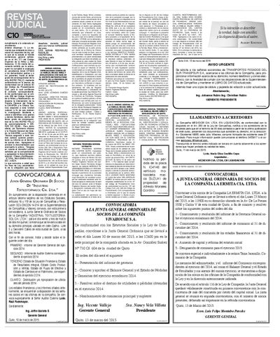 CONVOCATORIA A JUNTA GENERAL ORDINARIA DE SOCIOS DE LA COMPAÑÍA LA ERMITA CIA. LTDA. Convocase a los socios de la Compañía LA ERMITA CIA. LTDA. a la Junta General Ordinaria que se llevará a efecto el día Lunes 23 Marzo del 2015, a las 11H00 en su domicilio ubicado en la Av. De La Prensa 3558 y Carlos V de esta ciudad de Quito, a fin de conocer y resolver sobre los siguientes puntos del orden del día: 1.- Conocimiento y resolución del informe de la Gerencia General sobre el ejercicio económico del 2014;