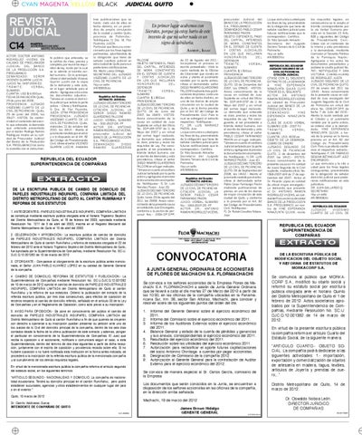 EXTRACTO DE LA ESCRITURA PUBLICA DE CAMBIO DE DOMICILIO DE PAPELES INDUSTRIALES INDUPAPEL COMPAÑIA LIMITADA DEL DISTRITO METROPOLITANO DE QUITO AL CANTON RUMIÑAHUI Y REFORMA DE SUS ESTATUTOS 1. ANTECEDENTES.- PAPELES INDUSTRIALES INDUPAPEL COMPAÑIA LIMITADA se constituyó mediante escritura pública otorgada ante el Notario Trigésimo Séptimo del Distrito Metropolitano de Quito, el 18 de febrero del 2003, aprobada mediante Resolución No. 1211 de 3 de abril del 2003, inscrita en el Registro Mercantil del Distrito Metropolitano de Quito el 10 de abril del 2003. 2. CELEBRACIÓN Y APROBACIÓN.- La escritura pública de cambio de domicilio de PAPELES INDUSTRIALES INDUPAPEL COMPAÑIA LIMITADA del Distrito Metropolitano de Quito al cantón Rumiñahui y reforma de estatutos otorgada el 22 de febrero del 2012 ante el Notario Trigésimo Séptimo del Distrito Metropolitano de Quito, fue aprobada por la Superintendencia de Compañías, mediante Resolución No. SC.IJ. DJC.Q.12.001282 de 10 de marzo de 2012 3. OTORGANTE.- Comparece al otorgamiento de la escritura pública antes mencionada, el Señor JUAN PABLO ALVAREZ LOPEZ en su calidad de Gerente General de la compañía. 4. CAMBIO DE DOMICILIO, REFORMA DE ESTATUTOS Y PUBLICACION.- La Superintendencia de Compañías mediante Resolución No. SC.IJ.DJC.Q.12.001282 de 10 de marzo de 2012 aprobó el cambio de domicilio de PAPELES INDUSTRIALES INDUPAPEL COMPAÑIA LIMITADA del Distrito Metropolitano de Quito al cantón Rumiñahui y la reforma de sus estatutos. Ordenó la publicación del extracto de la referida escritura pública, por tres días consecutivos, para efectos de oposición de terceros respecto al cambio de domicilio referido, señalado en el artículo 33 de la Ley de Compañías y en el Reglamento de Oposición, como acto previo a su inscripción. 5. AVISO PARA OPOSICIÓN.- Se pone en conocimiento del público el cambio de domicilio de PAPELES INDUSTRIALES INDUPAPEL COMPAÑIA LIMITADA del Distrito Metropolitano de Quito al cantón Rumiñahui a fin de que quienes se creyeren con derecho a oponerse a su inscripción puedan presentar su petición ante uno de los Jueces de lo Civil del domicilio principal de la compañía, dentro de los seis días contados desde la fecha de la última publicación de este extracto y además, pongan el particular en conocimiento de la Superintendencia de Compañías. El Juez que reciba la oposición o el accionante, notificará o comunicará según el caso, a esta Superintendencia, dentro del término de dos días siguientes a partir de dicha recepción, juntamente con el escrito de oposición y providencia recaída sobre ella. Si no hubiere oposición o no fuere notificada esta Institución en la forma antes indicada, se procederá a la inscripción de la referida escritura pública de la mencionada compañía y al cumplimiento de los demás requisitos legales. En virtud de la mencionada escritura pública la compañía reforma el artículo segundo del estatuto social, en los siguientes términos: “ARTICULO SEGUNDO.- NACIONALIDAD Y DOMICILIO. La compañía es nacionalidad ecuatoriana. Tendrá su domicilio principal en el cantón Rumiñahui, pero podrá establecer sucursales, agencias y otros establecimientos en cualquier lugar del país o en el exterior.” Quito, 10 marzo de 2012