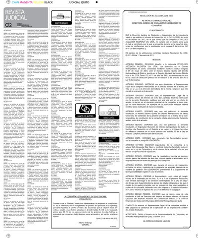 RESOLUCIÓN No. SC.IJ.DJDL.Q.13. 1300 AB. PATRICIA CHIRIBOGA SÁNCHEZ DIRECTORA JURÍDICA DE DISOLUCIÓN Y LIQUIDACIÓN DE COMPAÑÍAS CONSIDERANDO: QUE la Dirección Jurídica de Disolución y Liquidación, de la Intendencia Jurídica, ha emitido el Informe de Inspección No. IJ.DJDL.Q.13.191 de fecha 04 de febrero de 2013, en el que consta que la compañía PETROLEROS ASOCIADOS RILOPETSA CIA. LTDA., no cumple con el objeto social para el cual se constituyó, por lo que se encuentra inmersa en la causal de disolución de conformidad con lo establecido en el numeral 5 del artículo 361 de la Ley de Compañías; y, EN ejercicio de las atribuciones conferidas mediante Resolución No. ADMQ-2011-006 de 17 de enero de 2011; RESUELVE: ARTÍCULO PRIMERO.- DECLARAR disuelta a la compañía PETROLEROS ASOCIADOS RILOPETSA CIA. LTDA., con domicilio en el Distrito Metropolitano de Quito, constituida mediante escritura pública otorgada el 09 de mayo de 2001, ante el Notario Décimo Quinto del Distrito Metropolitano de Quito e inscrita en el Registro Mercantil del mismo Distrito bajo el No. 2718, Tomo 132, el 11 de julio de 2001, por encontrarse incursa en la causal de disolución prevista en el numeral 5 del artículo 361 de la Ley de Compañías. ARTÍCULO SEGUNDO.- NOTIFICAR con esta Resolución al Representante Legal de la compañía mencionada en el artículo anterior, en la forma prevista en la Ley, en la dirección domiciliaria de la misma y disponer que éste cumpla lo ordenado en la presente. ARTÍCULO TERCERO.- DISPONER que, el Representante Legal de la compañía, dentro del término de ocho días, contado desde la notificación con la presente Resolución, publique por una sola vez, en un diario de amplia circulación en el domicilio principal de la compañía, el texto íntegro de esta Resolución. Un ejemplar de la publicación realizada deberá remitirse a esta institución de manera inmediata. ARTÍCULO CUARTO.- DISPONER que, una vez publicada la presente Resolución, el Notario Décimo Quinto del Distrito Metropolitano de Quito, tome nota del contenido de la presente al margen de la matriz de la escritura pública de constitución de la compañía citada anteriormente. Cumplido, sentará razón de lo actuado. ARTÍCULO QUINTO.- DISPONER que, una vez publicada la presente Resolución, el Registrador Mercantil del Distrito Metropolitano de Quito: a) Inscriba esta Resolución en el Registro a su cargo; y, b) Ponga las notas de referencia previstas en el inciso primero del artículo 51 de la Ley de Registro. Cumplido, sentará razón de lo actuado. ARTÍCULO SEXTO.- DISPONER que, ejecutadas las formalidades prescritas, la compañía se ponga EN LIQUIDACIÓN. ARTÍCULO SÉPTIMO.- DESIGNAR Li qui da do ra de la compañía, a la señora Ruth Alexandra Díaz Yánez y conferirle todas las facultades determi nadas en la Ley de Compañías y en el estatuto de la sociedad, a fin de que efectúe las operaciones de liquidación. ARTÍCULO OCTAVO.- DISPONER que, la Liquidadora inscriba su nombra miento dentro del término de diez días, contado desde su aceptación, en el Registro Mercantil del domicilio principal de la compañía. ARTÍCULO NOVENO.- DISPONER que, durante el proceso de liquidación, en todos los actos y contratos de la compañía, se agreguen después de su nombre las palabras "EN LIQUIDACION", previniendo a la Liquidadora de las responsabilidades legales en caso de omisión. ARTÍCULO DÉCIMO.- PREVENIR al Representante Legal, sobre el cumpli miento de lo ordenado por los Arts. 3º, 4º y 5º de la presente Resolución, cuya omisión dará lugar a las sanciones contempladas en la Ley, sin perjui cio de que esta Superintendencia ejecute las citadas diligencias y de que el monto de los gastos incurridos con los recargos de Ley, sean agregados al pasivo de la compañía, debiendo este valor ingresar a la cuenta denomina da "Cuenta Rotativa de Ingresos No. 625275-3 del Banco de Guayaquil". ARTÍCULO DÉCIMO PRIMERO.- DIS PO NER que, se re mi ta co pia de es ta Resolución al Jefe de Coactivas del Servicio de Rentas Internas, al Director Ejecutivo del Instituto Nacional de Contratación Pública y al Director Financiero de Rentas del I. Municipio del Distrito Metropolitano de Quito.