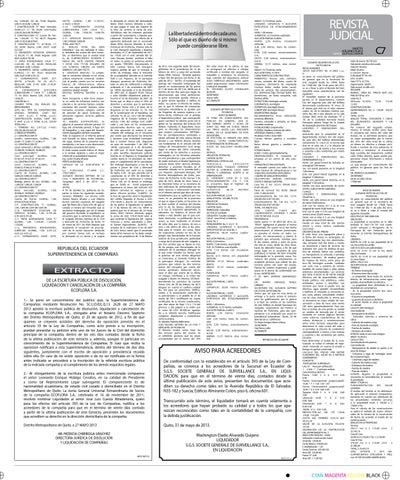 AVISO PARA ACREEDORES De conformidad con lo establecido en el artículo 393 de la Ley de Compañías, se convoca a los acreedores de la Sucursal en Ecuador de S.G.S. SOCIETE GENERALE DE SURVEILLANCE S.A., EN LIQUIDACIÓN, para que en el término de veinte días, contados desde la última publicación de este aviso, presenten los documentos que acrediten su derecho como tales en la Avenida República de El Salvador, N35-182 y Suecia, Edificio Almirante Colón, piso 6, oficina 601. Transcurrido este término, el liquidador tomará en cuenta solamente a los acreedores que hayan probado su calidad y a todos los que aparezcan reconocidos como tales en la contabilidad de la compañía, con la debida justificación. Quito, 31 de mayo de 2013.
