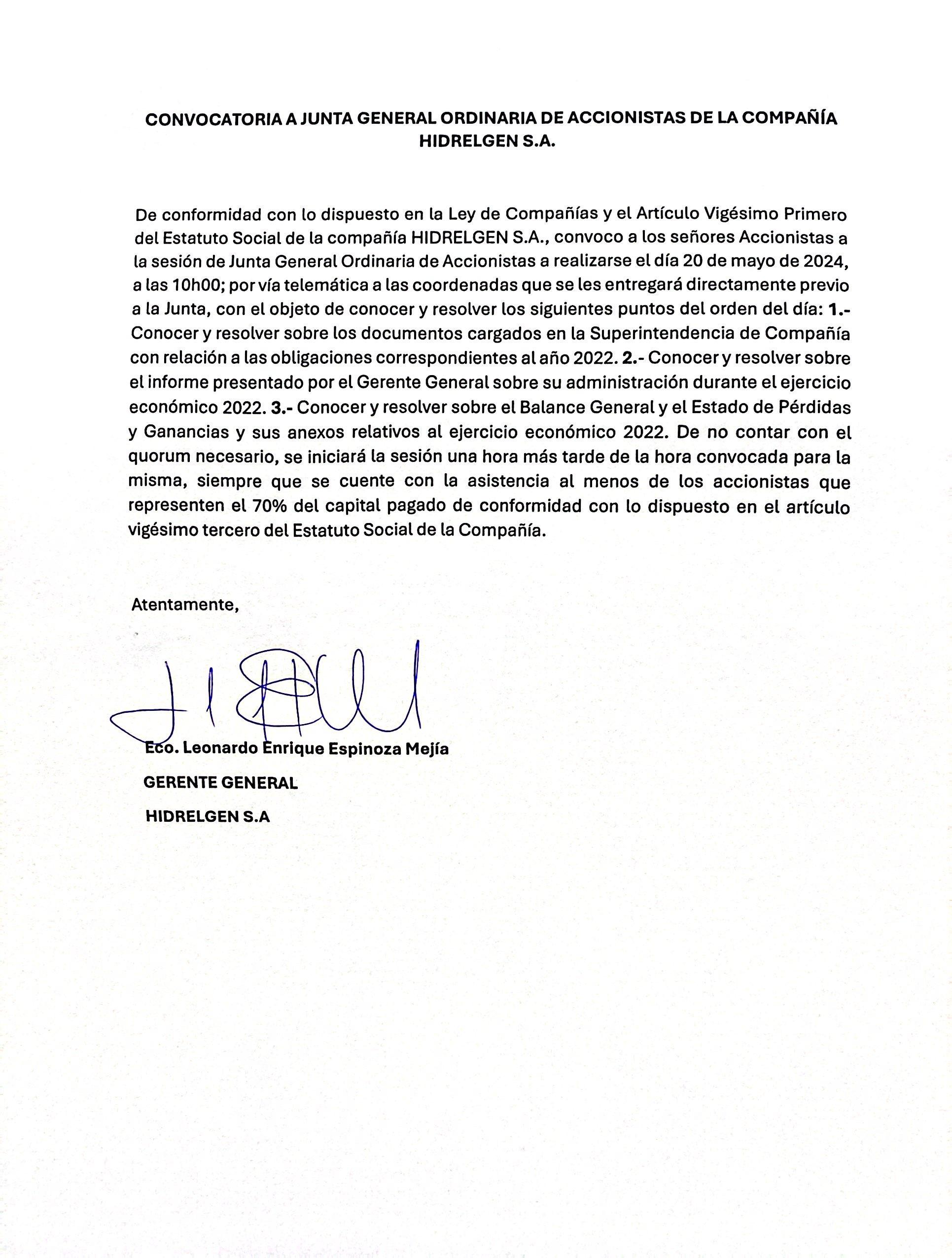 CONVOCATORIA A JUNTA GENERAL ORDINARIA DE ACCIONISTAS DE LA COMPAÑÍA HIDRELGEN S.A.