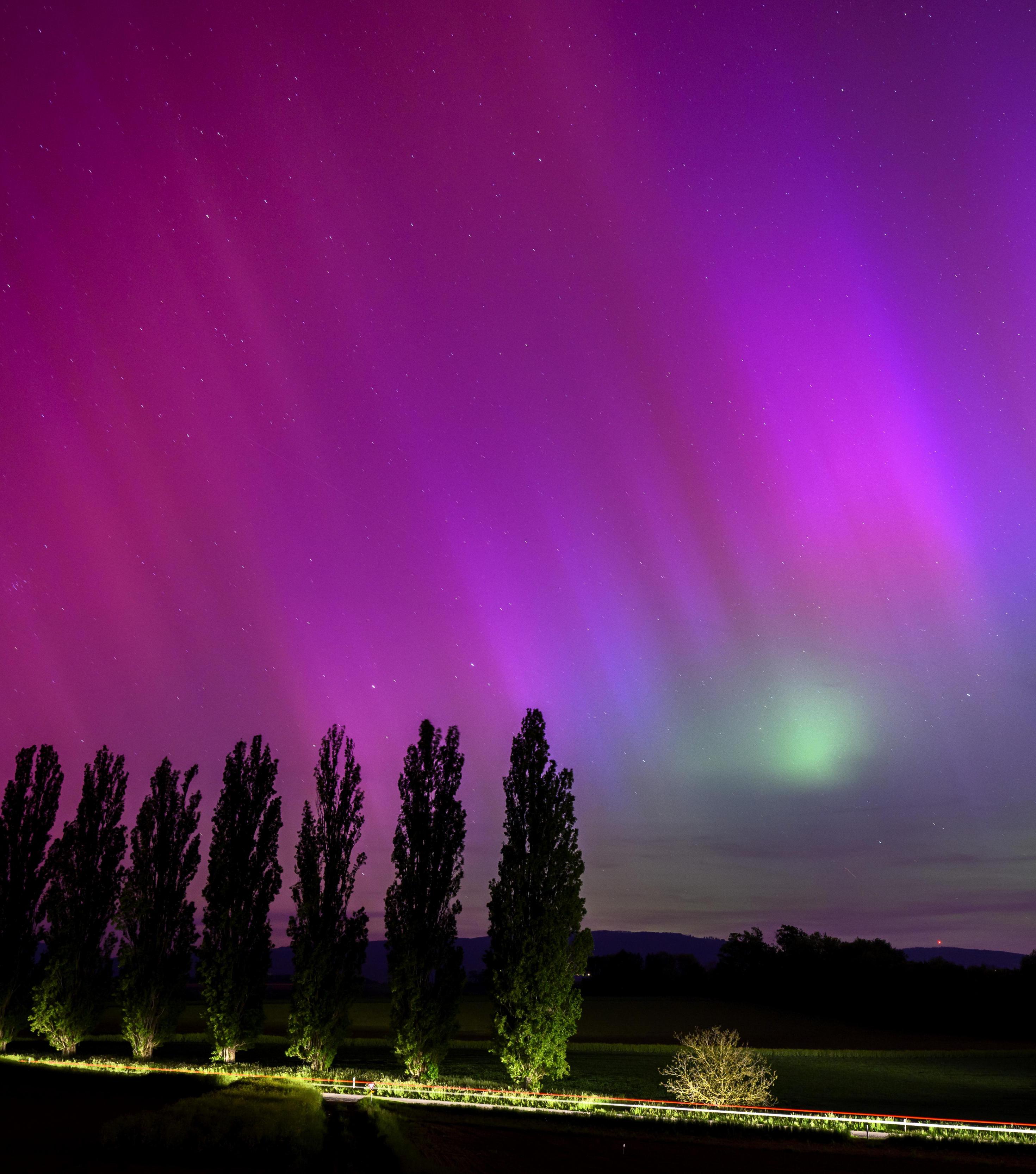 Vista de la aurora boreal ocurrida durante la noche del 10 de mayo de 2024 en Daillens, Suiza. La Oficina Nacional de Administración Oceánica y Atmosférica de EE.UU. (NOAA, en inglés), antes Servicio Meteorológico Nacional, reportó “condiciones geomagnéticas extremas” por primera vez desde octubre de 2003. Es este fenómeno el responsable de que las auroras boreales puedan vislumbrarse en lugares donde normalmente no se ven. EFE / Laurent Gillieron