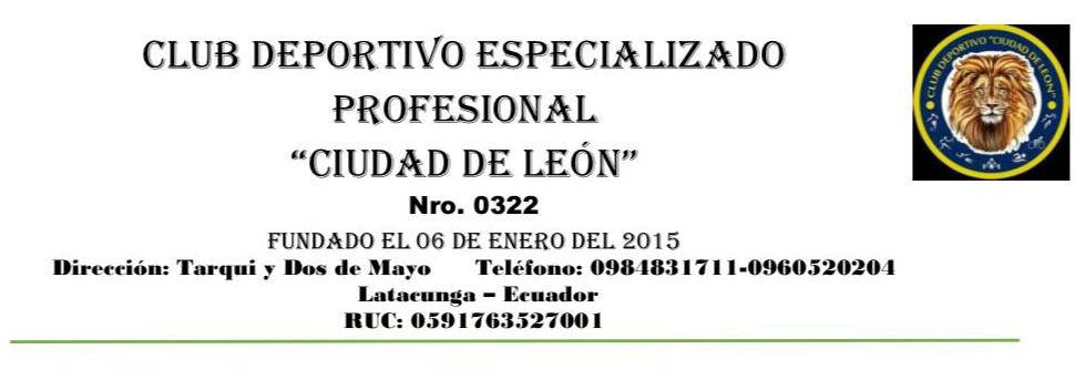 De conformidad a lo que dispone el Art. 153 de la Ley del Deporte, Educacion Fisica y Recreacion y en todo su cuerpo legal del Reglamento General a la Ley del Deporte, Educacion Fisica y Recreacion, en consideracion al Acuerdo Ministerial N° 0389 y al Estatuto vigente del Club y mas normas legales que rige el club, tiene a bien CONVOCAR A LA ASAMBLEA GENERAL DE ELECCIONES A LOS SOCIOS DEL CLUB DEPORTIVO ESPECIALIZADO PROFESIONAL “CIUDAD DE LEON” 2024 – 2028 que se llevara a cabo el día MIÉRCOLES 24 DE ABRIL DEL 2024 A PARTIR DE LAS 19H30 en la sede de club que se encuentra ubicada en las calles dos de mayo y Tarqui del Barrio San Agusto parroquia La Matriz, Canton Latacunga, provincia de Cotopaxi con el fn de tratar el siguiente orden del día: