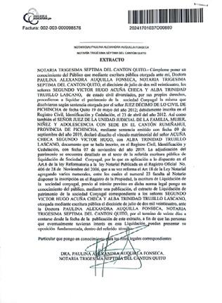 UNIDAD JUDICIAL ESPECIALIZADA CUARTA DE LA FAMILIA, MUJER, NIÑEZ Y ADOLESCENCIA CON SEDE EN LA PARROQUIA IÑAQUITO DEL DISTRITO METROPOLITANO DE QUITO, PROVINCIA DE PICHINCHA.- Quito, jueves 25 de julio del 2024, a las 10h33. VISTOS: Agréguese a los autos el acta de Juramento de desconocimiento de domicilio del demandado, por parte de la actora, con lo cual se ha dado cumplimiento al auto inmediato anterior. Avoco conocimiento en mi calidad de Jueza de la Unidad Judicial de la Familia, Mujer, Niñez y Adolescencia con sede en la Parroquia Iñaquito del Distrito Metropolitano de Quito, Provincia de Pichincha y conforme el sorteo electrónico de Ley precedente, en lo principal.- (i) CALIFICACION: El acto de proposición-demanda de Autorización de Salida del País de las hijas menores de edad ISABELLA y BERNARDA ALMEIDA GARCIA, presentada por su madre la señora TATIANA ALEJANDRA GARCIA SALAZAR, reúne los requisitos de ley establecidos en los Art. 142 y 143 del COGEP, por lo que se la admite a trámite en PROCEDIMIENTO SUMARIO determinado en el Art. 334.3 ibídem. (ii) CITACION: CÍTESE de inmediato por la prensa, al amparo de lo dispuesto en el artículo 56 del COGEP, con la demanda y este auto en su calidad de parte demandada al señor RAMIRO ANDRES ALMEIDA VITERI C.C.N° 1710896406, en un periódico de amplia circulación nacional. Se advierte a la parte demandada de su obligación de comparecer a juicio en esta Unidad Judicial con sede en Quito y contestar a la demanda fenecido el término establecido en el penúltimo inciso del Art. 56 ibidem, al cual se añadirá el término de DIEZ días dispuesto en el Art. 333 numeral 3 del COGEP, contestación que debe cumplir lo determinado en los artículos 151 y 152 del mismo cuerpo legal; y lo dispuesto en el Art. 66 del COGEP, en concordancia con el artículo 56 de la Ley de Comercio Electrónico, Firmas Electrónicas y Mensajes de Datos, señale domicilio judicial electrónico en un correo electrónico, de un-a abogado-a-, para futuras notificaciones. Caso contrario el proceso se sustanciará con las implicaciones que señala el Art.157 del COGEP.- (iii) PRUEBA.- Téngase en cuenta el anuncio de los medios probatorios que se ofrecen para acreditar los hechos, incorpórese al proceso los medios probatorios que adjunta a la demanda. (iv) AUDIENCIA ÚNICA. De conformidad con el artículo 333.4 del COGEP, la audiencia única se fijará una vez que sea citada la parte demandada en legal y debida forma. (v) ANUNCIO DE PRUEBAS. Con relación a la prueba anunciada por la accionante, se dispone: a) Agréguese a los autos los documentos que acompaña la parte actora en su demanda, lo que será considerado en el momento procesal oportuno, siempre y cuando sea procedente y conforme a derecho. b) En la Audiencia Unica, de ser procedente recéptese la declaración de parte del demandado Sr. RAMIRO ANDRES ALMEIDA VITERI C.C.N° 1710896406, con sujeción a lo dispuesto en el Art. 187 del COGEP, quien comparecerá por sí y no por interpuesta persona. c).- AUDIENCIA RESERVADA, con fundamento en el Art. 45 de la Constitución de la República, Art. 31 último inciso del COGEP, en concordancia con el Art. 60 del CONA, a las hijas menores de edad ISABELLA y BERNARDA ALMEIDA GARCIA, serán escuchadas el día de la audiencia única. d) En la audiencia única, se ser procedente se sustentará la pericia realizada por el Señor Perito Ing. Cristian Leandro Zúñiga Quezada. e) Con sujeción l Art. 142.8 en concordancia con el art. 159 del COGEP ofíciese a la Gerencia del Proyecto de Fortalecimiento Institucional de las Unidades de Control Migratorio, Migración y Extranjería, a fin de que remita el Movimiento Migratorio del ciudadano RAMIRO ANDRES ALMEIDA VITERI C.C. N° 1710896406, de hace 5 años atrás. (vii) NOTIFICACIONES.- Téngase en cuenta el casillero judicial físico N° 4525 y correo electrónico gialaw_5@yahoo.com casillero electrónico 1802246635; correo electrónico lzambranoro7@hotmail.com y casillero electrónico 0706321734 señalado por la actora, y la autorización dada a su abogado patrocinador.- Se conmina a la actora a fin de que se acerque a esta Unidad Judicial para que retire el extracto para la citación y el oficio despachado. Actúe el Dr. José Proaño Armas, en calidad de Secretario Titular de esta Unidad Judicial.- [Autorización de Salida ref. No. 17204-2024-02316-COGEP-ggg.].- Cítese y Notifíquese.-