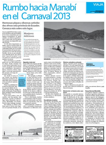 Con su capital Portoviejo, es uno de los destinos más pretendidos de la Costa ecuatoriana por sus lugares encantadores, su gente amable, su deliciosa gastronomía y, sobre todo, por las playas Los ceviches de pescado, de con paisajes incomparables que camarón y de concha están entre allí reposan. las especialidades de la provincia Y si de sitios importantes se de Manabí. Igualmente , son muy populares otros mariscos como los habla, usted no puede dejar de ostiones. Pero , las sopas ‘viche de conocer Manta, asentada en una pescado’, elaborada con maní, y el espléndida bahía que le ha dado ‘sancocho’ con plátano y pescado, la característica de puerto interestán todos los días en la mesa de nacional en la costa del Océano turistas y pobladores. En Puerto LóPacífico. En la era precolombipez, también, se degusta el ceviche na se llamaba Jocay, que quiere de concha. decir ‘casa de los peces’ y era un punto de comercio para los mantas y los incas. arrepentirá. Esta provincia es privilegiada por sus 350 kilómetros Algarabía a todo nivel de playa, desde Ayampe (en En los diferentes lugares de Mael sur) hasta Pedernales (en el nabí se preparan actividades norte), geografía caracterizada novedosas por las fiestas de Carpor acantilados, desemboca- naval. Puede disfrutar de pregoduras, estuarios, islotes, islas, nes, desfiles con comparsas colajas y rocas que muestran be- loridas, música en vivo, elección llos parajes a lo largo de de las reinas, actos cultula zona costera. rales y más. Así, desde el norte al El Dato Por ejemplo, en Manta sur cuenta con muchos se tiene previsto la prebalnearios marítimos y de Los precios de sentación de artistas naagua dulce que se quedan las comida varía, cionales e internacionales por ejemplo, la en la memoria de quienes corvina entera y otros eventos que, en frita cuesta 6 los visitan. rueda de prensa reciente, dólares, el filete Tiene la posibilidad de de pescado 4 y el alcalde, Jaime Estrada, ir hacia la zona norte, don- el cebiche, $ 5. el jefe de la Policía Pablo de conocerá Bahía de CaAguirre y representantes ráquez, San Vicente, Chirije, Co- de los artistas, dieron a conocer jimíes, Pedernales, Punta Palmar, detalles de los shows y diferenJama, El Matal, Canóa, Don Juan, tes actos que se ofrecerán de maBriceño y otras. nera gratuita desde el primero En la zona centro y sur, en hasta el 10 de febrero. cambio, está San Jacinto, San Vico-C, Aldo Ranks, Américo Clemente, Crucita, El Murcié- y Luis Enrique serán los persolago, Santa Marianita, San Lo- najes internacionales que brinrenzo, Machalilla, Los Frailes, darán su espectáculo, cada uno Puerto López, Salango, Ayampe. con su género musical. Sus maletas ya deben estar Adicionalmente, artistas lolistas para ir hacia estos luga- cales y nacionales estarán preres en el próximo feriado, no se sentándose en diferentes esce-