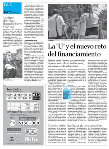 La ‘U’ y el nuevo reto del financiamiento Existen otras fuentes para solventar el presupuesto de las instituciones, que requieren de autogestión. Alrededor de la mitad del pre- dirá en la obtención de recursupuesto de las universidades sos económicos para su funprivadas se financia con los cionamiento. Las autoridades aranceles y las matrículas de revisarán el documento que sus estudiantes, si bien cada una ya está disponible en la página obtiene recursos de diferentes web del CES, previo a emitir fuentes y los porcentajes varían, un comentario, confirmó la confirmó Fidel Márquez, rector coordinadora de medios de la institución. de la universidad Ecotec. Él fue uno de los miembros de la comisión confor- Recursos mada por las universiEn Ecotec, entre el 60% dades privadas, que se EL DATO y el 70% del presupuesreunió con el Consejo to proviene de las matríde Educación Superior Las universida- culas y los aranceles de (CES) para elaborar el des no podrán los alrededor de 3.000 cobrar a sus reglamento que regula estudiantes por estudiantes que tiene la valores aranceles, matrículas otros universidad. Otro 25% que no sean y derechos en las ins- aranceles o se obtiene de la oferta tituciones particulares, derechos. de cursos de educación que está vigente. continua, que no son reDurante varias sesiones, gulados por el reglamento. los rectores de las institucioMárquez confirmó que esa nes llegaron a acuerdos con universidad ya cumplía con la entidad y, según Márquez, no incrementar los aranceles están de acuerdo en el 95% más allá del valor inflacionario del contenido del reglamento, anual, como disponían resoaunque todavía no lo debaten luciones transitorias del CES, a profundidad. por lo que esa disposición del En la Universidad San reglamento no les afectará. Francisco de Quito no hay toPero, de lo que ha revisadavía un pronunciamiento do, una de las modificaciones oficial respecto de la nueva que tendrán que hacer es sonormativa y de cómo esta inci- bre los seguros de salud. La