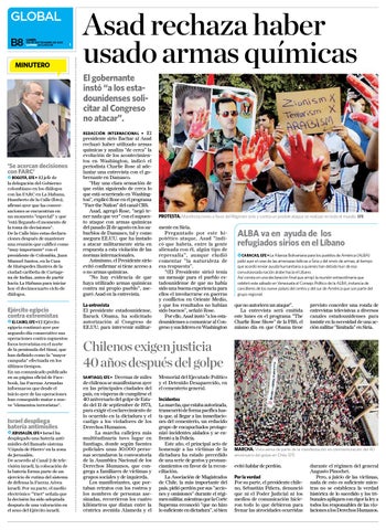 Chilenos exigen justicia 40 años después del golpe SantiaGo, eFe • Decenas de miles de chilenos se manifestaron ayer en las principales ciudades del país, en vísperas de cumplirse el 40 aniversario del golpe de Estado del 11 de septiembre de 1973, para exigir el esclarecimiento de lo ocurrido en la dictadura y el castigo a los violadores de los Derechos Humanos. La marcha callejera más multitudinaria tuvo lugar en Santiago, donde según fuentes policiales unas 30.000 personas secundaron la convocatoria de la Asamblea Nacional de los Derechos Humanos, que congrega a familiares de víctimas y grupos sociales y de izquierda. Los manifestantes, que portaban retratos con los rostros y los nombres de personas asesinadas, recorrieron los cuatro kilómetros que distan entre la céntrica avenida Alameda y el