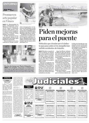 Vehículos que circulan por el viaducto que pasa sobre el río Junquillo han sufrido accidentes de tránsito. Vinces • Moradores cansados de tantos accidentes de tránsitos que se han suscitado a la altura del puente sobre el río Junquillo, el que conduce a los sectores de Matecito-Clarisa-BeboPavana (Los Ríos), Vernaza, Salitre (Guayas), ya no saben a quién recurrir. Ellos hacen un llamado a las autoridades del Ministerio de Transporte y Obras Públicas o a los gobiernos autónomos de Vinces y de la provincia para que doten al sector de las barandas que lleguen hasta la carretera que serviría para evitar accidentes en esta zona.