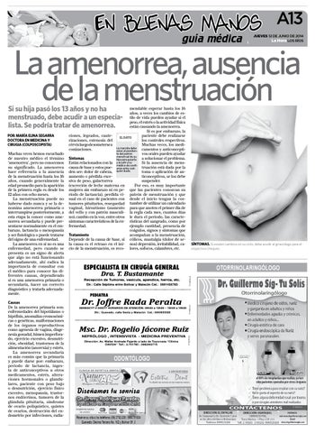 mendable esperar hasta los 16 años, a veces los cambios de estilo de vida pueden ayudar si el peso, el estrés o la actividad física están causando la amenorrea. Si es por embarazo, la ciones, legrados, cautepaciente debe realizarse El dato rizaciones, estenosis del los controles respectivos. cérvix luego de someterse a Muchas veces, los mediLa mamita debe conizaciones. estar al pendien- camentos y anticonceptite del patrón vos orales pueden ayudar menstrual de su a solucionar el problema. Síntomas hija para guiarla Si la ausencia de mensEstán relacionados con la y acudir a su médico de confitruación está dada por la causa de base y estos pue- anza ante cualtoma o aplicación de anden ser: dolor de cabeza, quier duda. ticonceptivos, se los debe aumento o pérdida excesuspender. siva de peso, galactorrea Por eso, es muy importante (excreción de leche materna en mujeres sin embarazo ni en pe- que las pacientes conozcan su riodo de lactancia), perdida vi- patrón de menstruación y que sual en el caso de pacientes con desde el inicio tengan la costumores pituitarios, resequedad tumbre de utilizar un calendario vaginal, hirsutismo (aumento para que anoten el primer día de del vello y con patrón masculi- la regla cada mes, cuantos días no), cambio en la voz, entre otros le dura el periodo, las caractesíntomas característicos de la en- rísticas del sangrado, como por ejemplo cantidad, presencia de fermedad. coágulos, signos y síntomas que acompañan a la menstruación, Tratamiento Depende de la causa de base, si cólicos, mastalgia (dolor de sela causa es el retraso en el ini- nos) depresión, irritabilidad, cacio de la menstruación, es reco- lores, sofocos, calambres, etc.