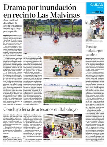 BABAHOYO • Alrededor de 150 familias son las que se encuentran aisladas en el recinto Las Malvinas, luego de que la creciente del río La Clementina dañara los muros de contención que fueron construidos en el sitio. Moradores del sector expresaron que al momento les inunda una profunda tristeza debido a que gran cantidad de cultivo de arroz se ha perdido, dejando en la nada aquellos agricultores que ahora tendrán que empezar desde cero. Nelson Contreras, uno de los más afectados por el desbordamiento del río, comentó que actualmente las pérdidas son incalculables ya que son varias las hectáreas de sembrío afectado, no pierden la esperanza de que el gobierno les otorgue algún tipo de ayuda ante lo sucedido. “La situación que vivimos por la inundación para nosotros ha sido un grave problema, eso no hubiera sucedido si la Prefectura hubiera realizado los trabajos de reforzamiento de los muros de contención con el debido tiempo”, enfatizó Contreras. Así mismo, Cristian Villasagua, director provincial de la Secretaría de Gestión de Riesgos en Los Ríos, dio a conocer que fue en el mes de octubre cuando se aprobó por parte de la Secretaría, los proyectos que ejecutó la prefectura y de seguro el trabajo no se lo hizo a tiempo debido a los trámites que toma, el que el Banco del Estado asigne el monto requerido para la ejecución de las obras. Ante lo sucedido en Las Malvi-