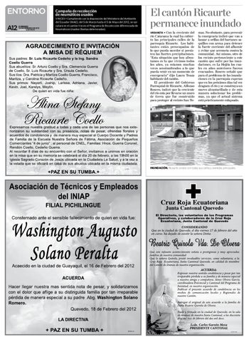 El cantón Ricaurte permanece inundado UrdANEtA • Con la creciente del río Catarama la cual ha cubierto las principales calles de la parroquia Ricaurte. Los habitantes están preocupados de lo que pueda suceder si persisten las fuertes precipitaciones. “Esta situación que hoy afrontamos es la que vivimos todos los años, ya estamos muchas veces acostumbrados a lo que pueda venir en un momento de emergencia” dijo Laura Toaza habitante del cantón. El presidente del Gobierno Parroquial de Ricaurte, Alfonso Rosero, indicó que la creciente del río esta por llevarse un muro de tierra que fue construido para proteger al recinto San To-